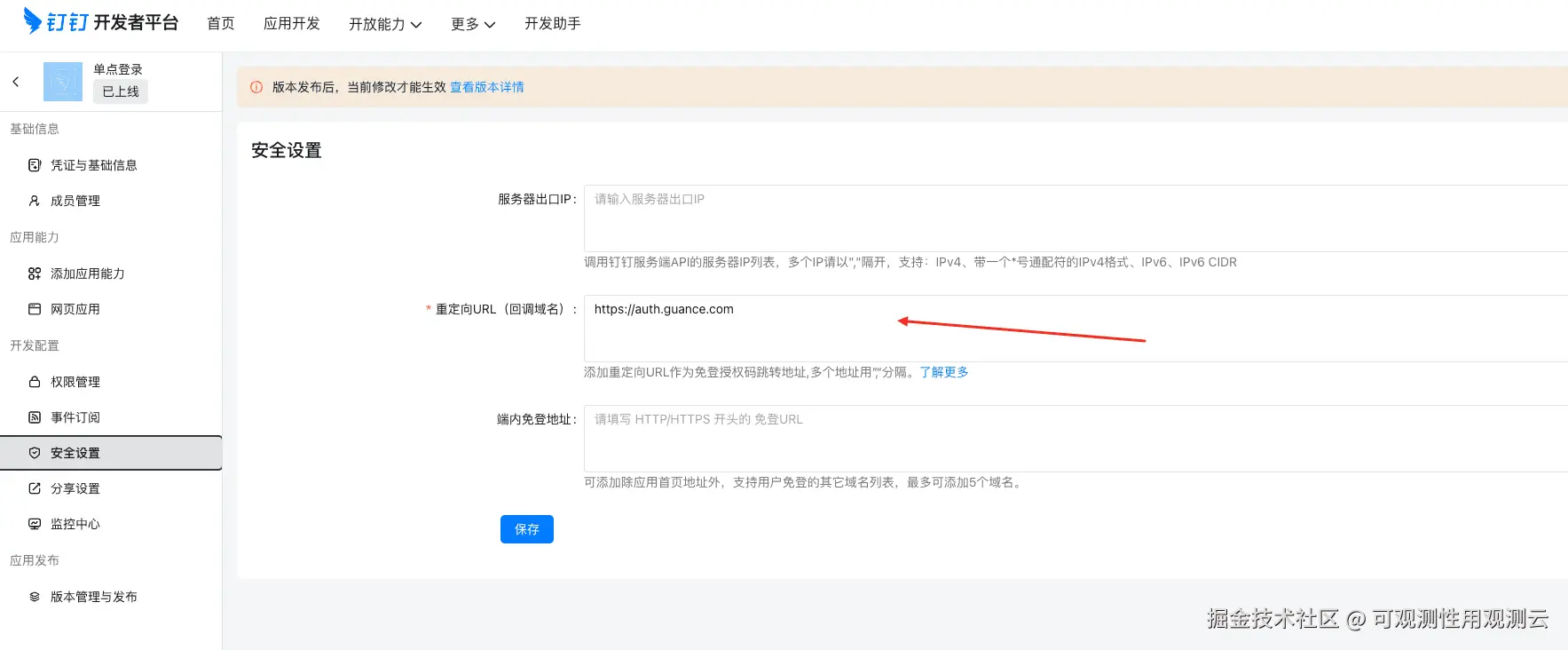 1、在钉钉应用的配置页面中,点击安全设置