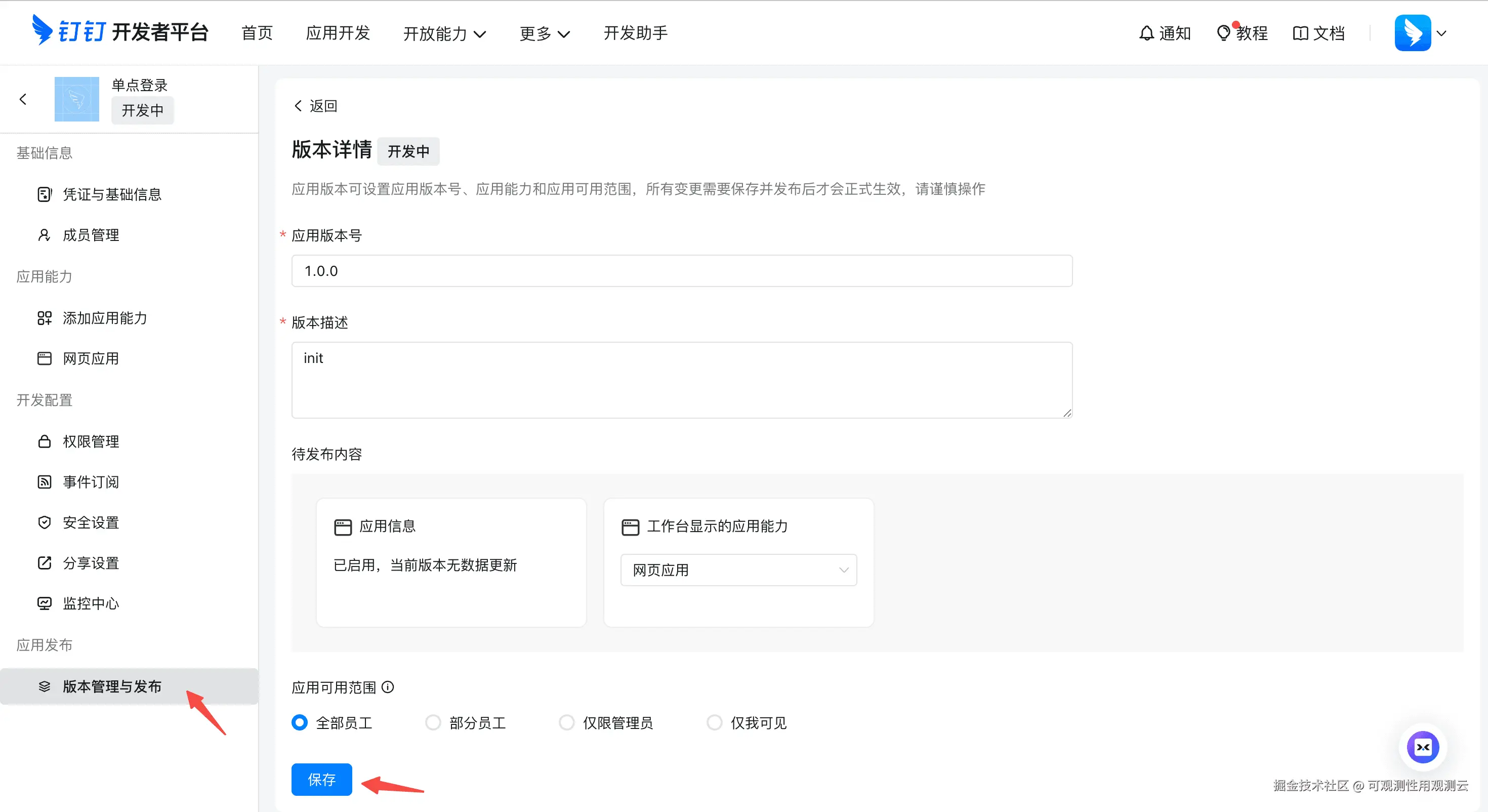 6、点击版本管理与发布 ,点击创建新版本 ,输入版本号和描述,应用可用范围按需选择员工范围,然后点击保存完成应用发布