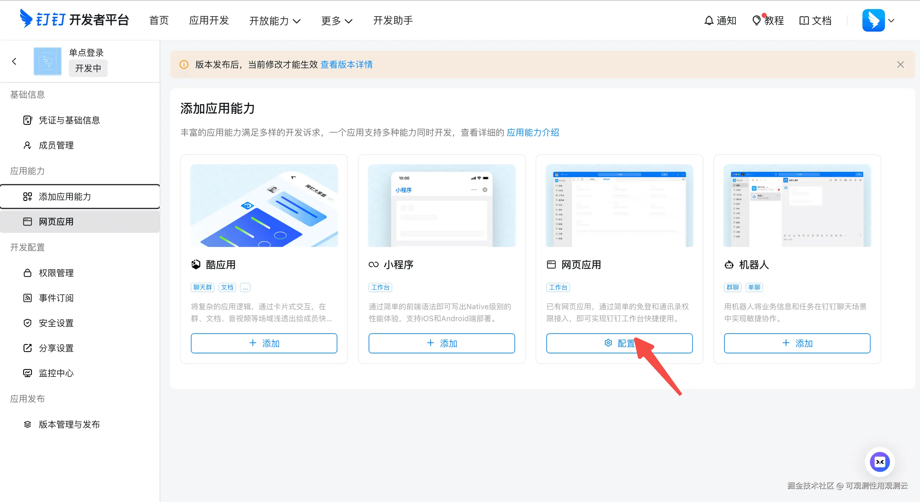 5、创建完成后会自动跳转应用管理页面,点击添加应用能力 ,选择网页应用 ,点击添加