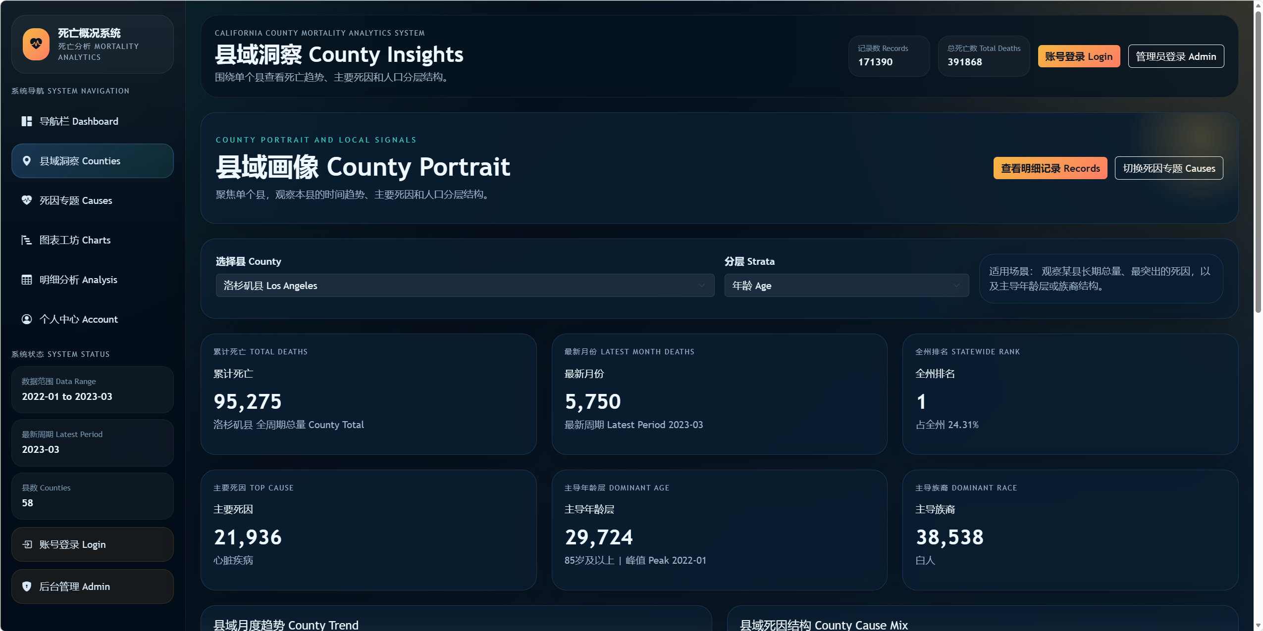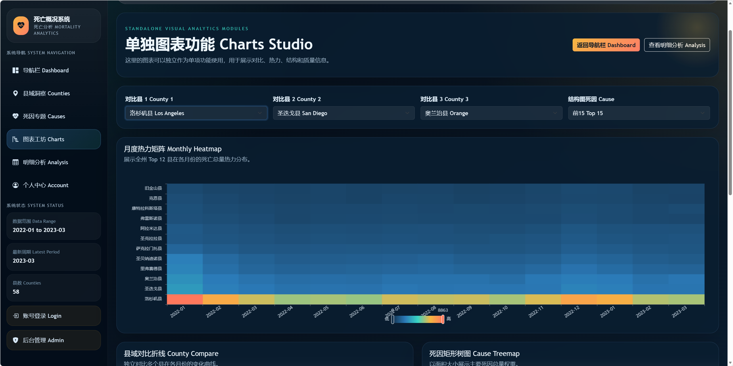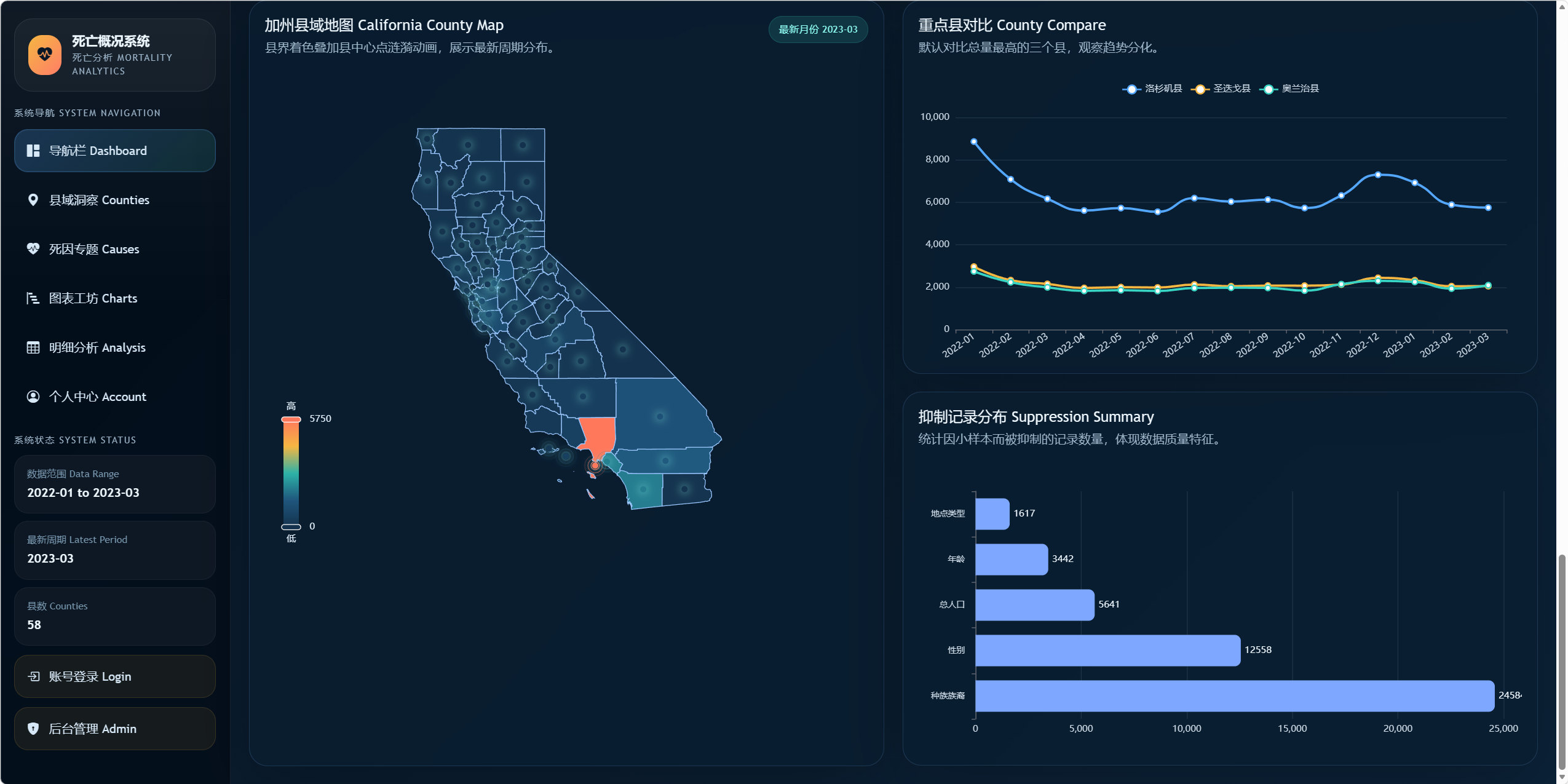 通过 Dashboard、县域专题、死因专题、图表工坊等模块展示加州各县死亡概况。
