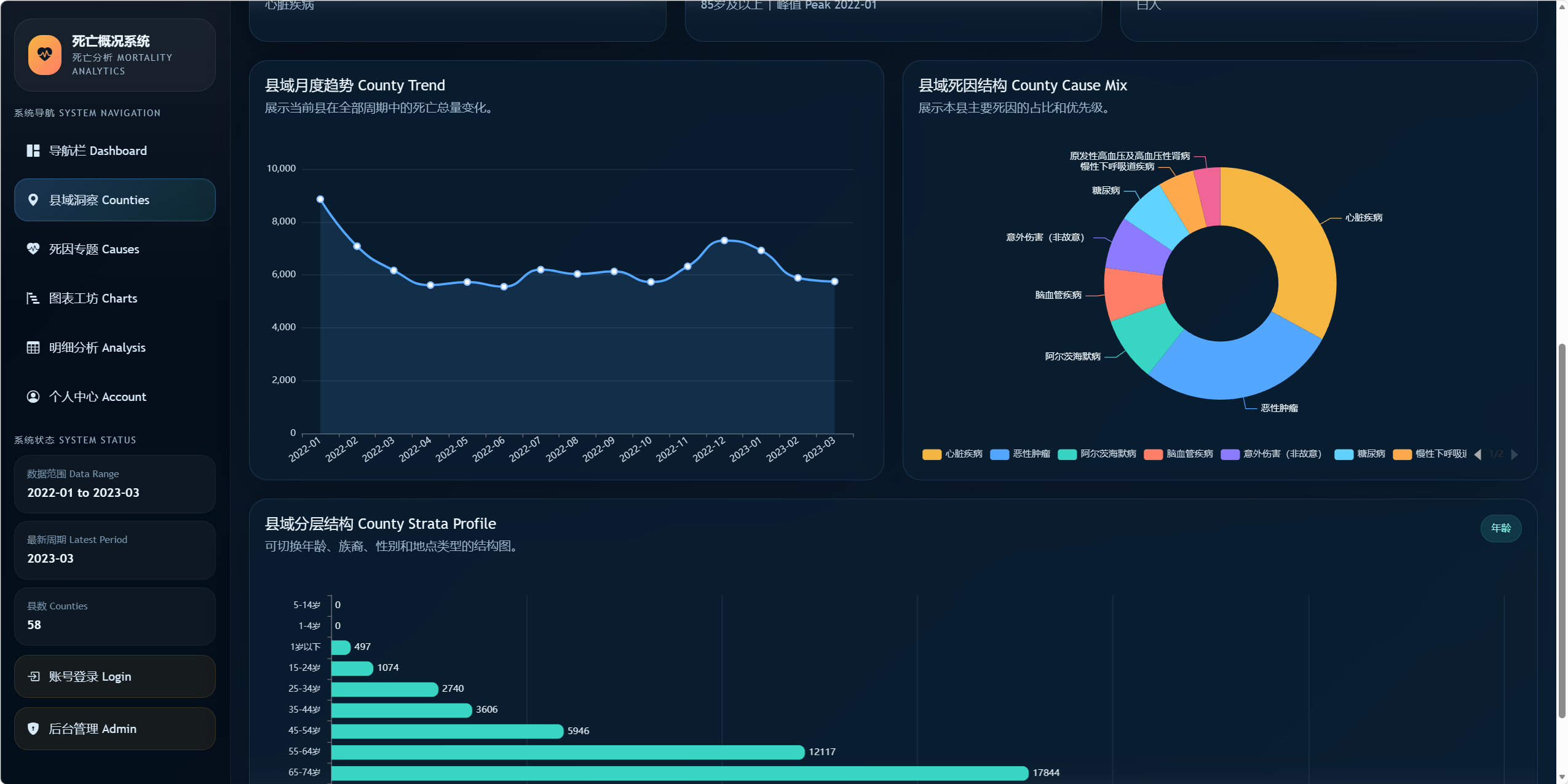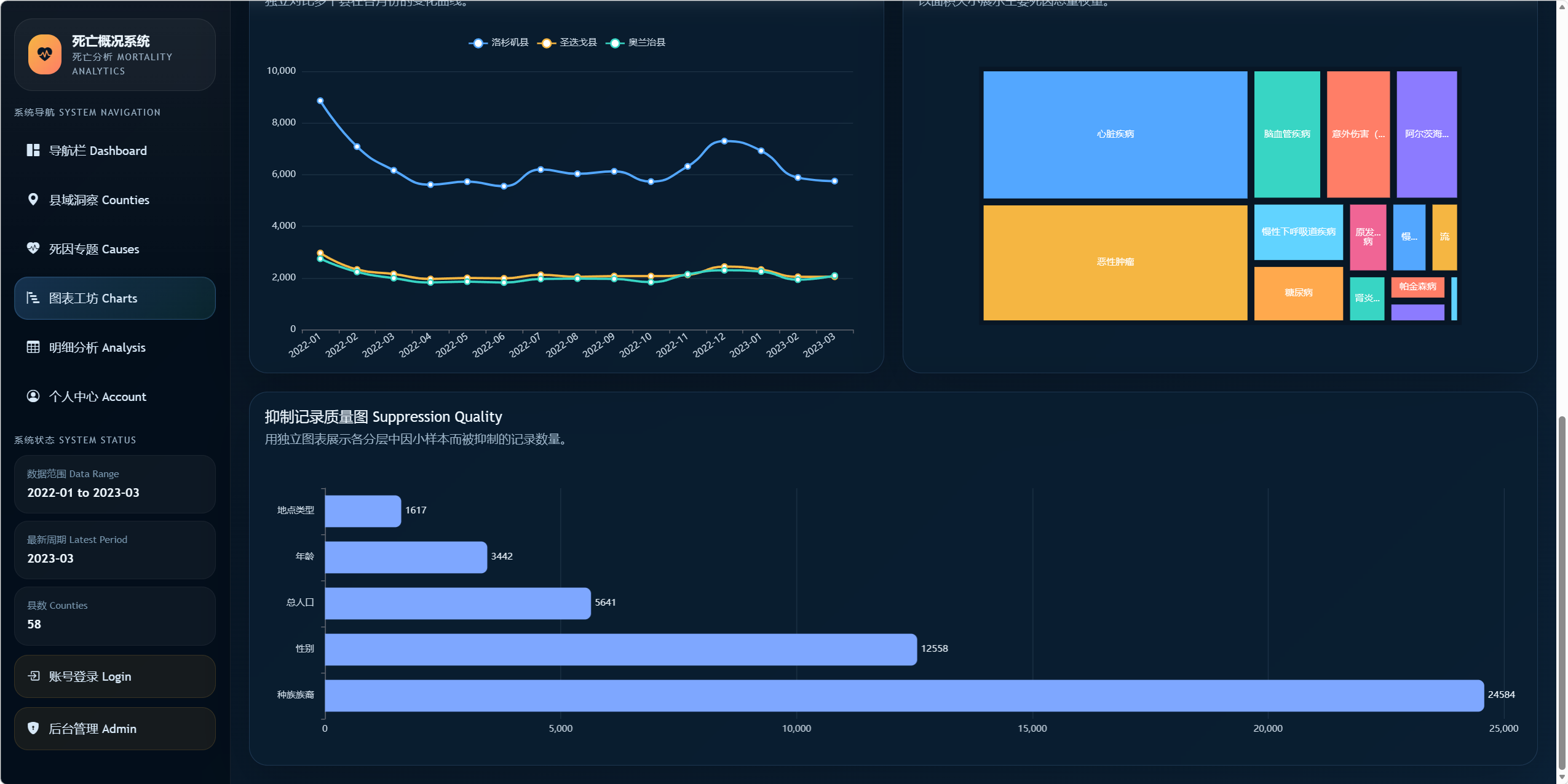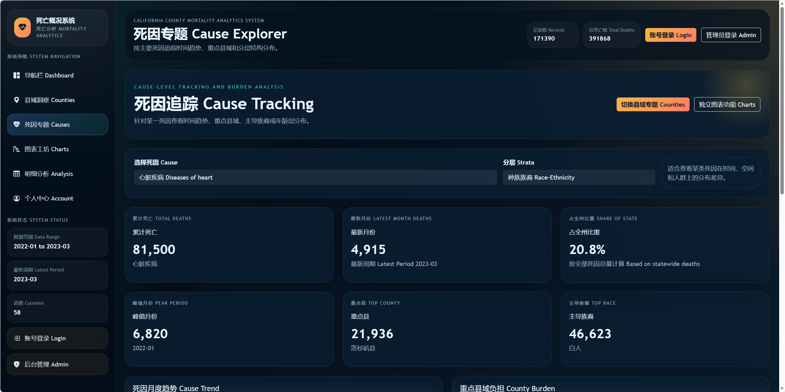 通过 Dashboard、县域专题、死因专题、图表工坊等模块展示加州各县死亡概况。