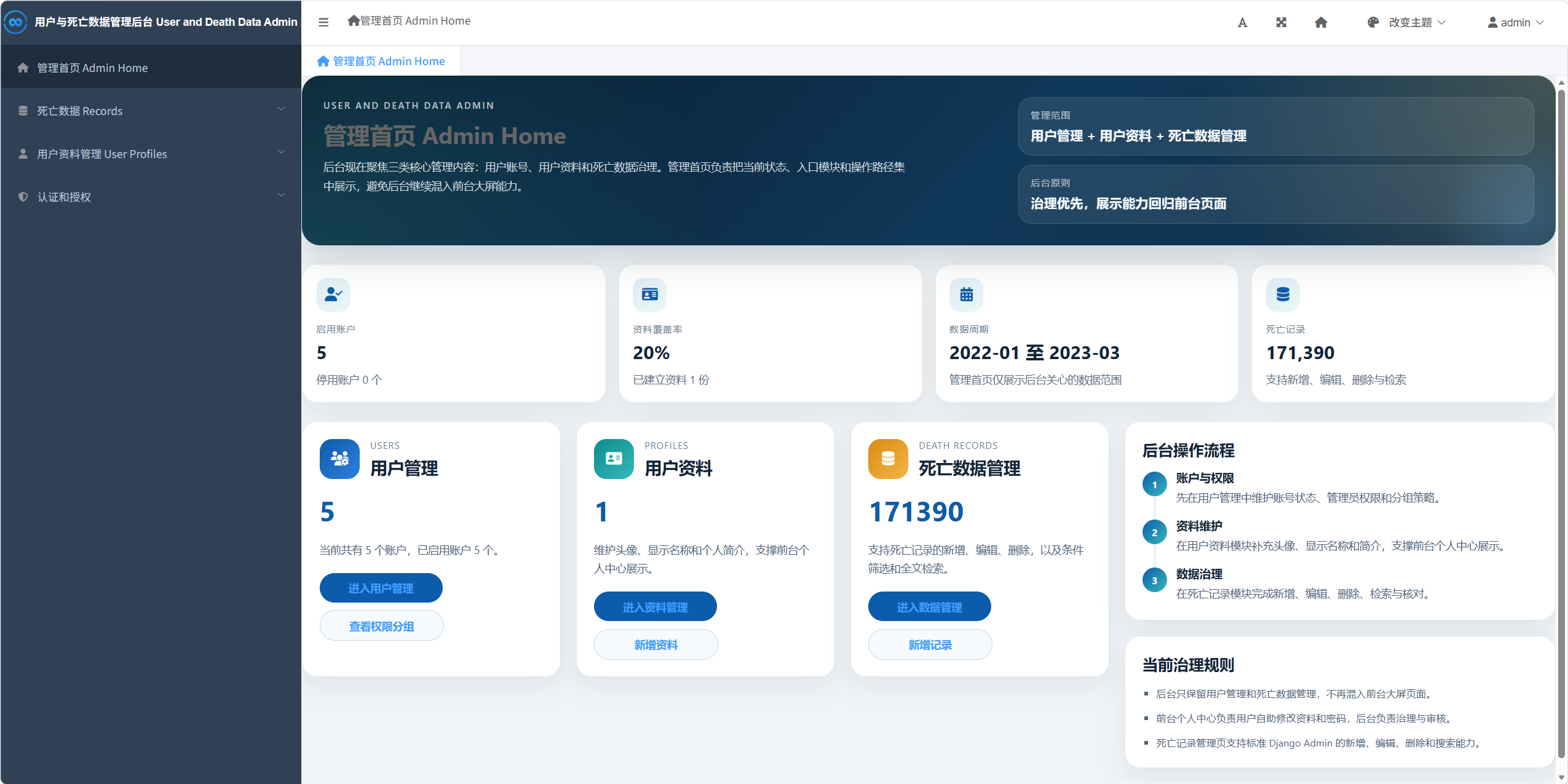 通过 Django Admin、管理首页、用户管理、用户资料管理和死亡数据管理,对系统账号与业务数据进行治理。
