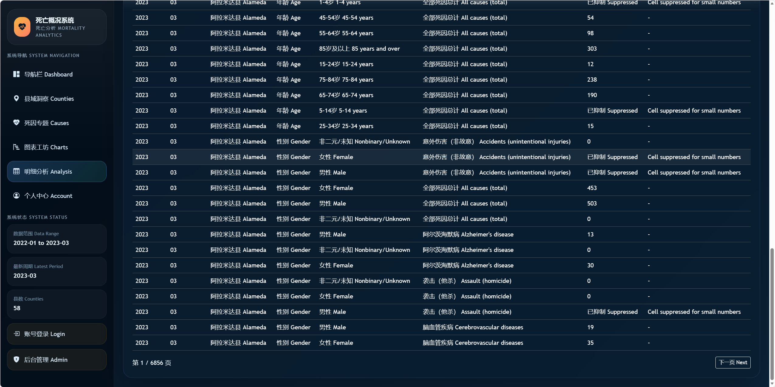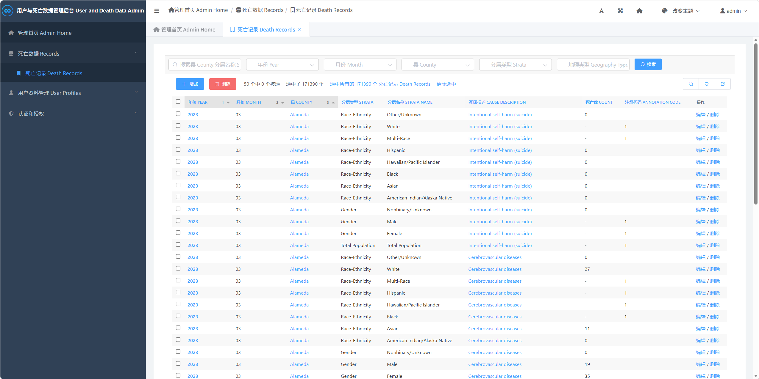该项目是一个以死亡统计数据为核心的数据分析与管理系统,既包含面向用户的前台分析页面,也包含面向管理员的数据治理后台。