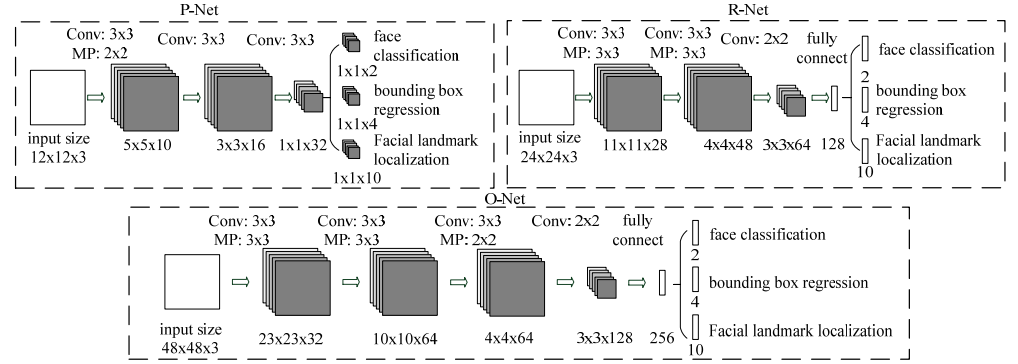 图 2.P-Net、R-Net 和 O-Net 的架构中,"MP"表示最大池化,"Conv"表示卷积。卷积和池化操作中的步长分别为 1 和 2 。