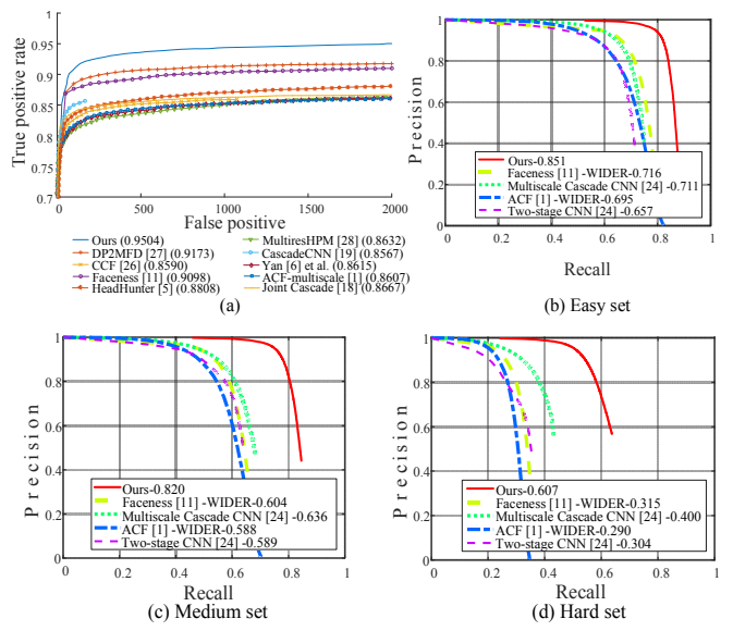 图 4.(a)对 FDDB 的评估。 (b - d)对 WIDER FACE 的三个子集的评估。在该方法名称之后的数字表示平均准确率。
