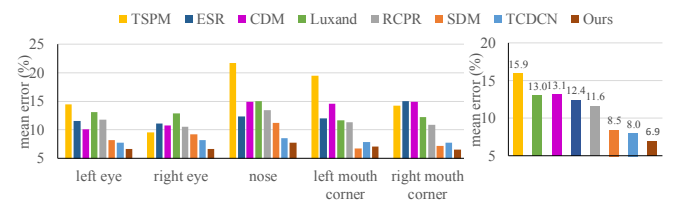 分析:平均误差低于ESR、SDM、TCDCN等方法,5点定位精度顶尖。