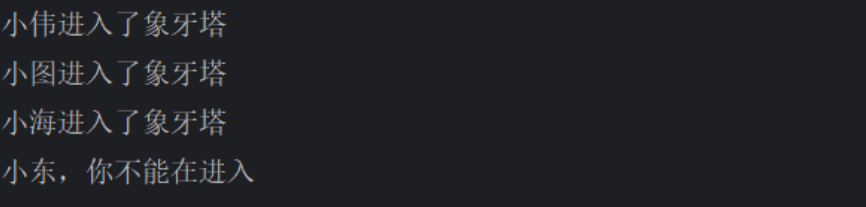 javapublic class App { public static void main(String[] args) { WizardTowerProxy proxy = new WizardTowerProxy(new LvoryTower()); proxy.enter(new Wizard("阿伟")); proxy.enter(new Wizard("图灵机")); proxy.enter(new Wizard("云海")); proxy.enter(new Wizard("东东哥")); } }