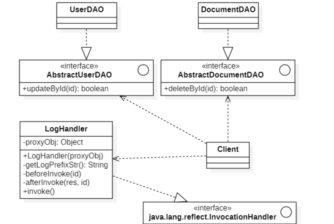 javapublic class Client { public static void main(String[] args) { //创建代理对象代理UserDAO AbstractUserDAO ud = new UserDAO(); InvocationHandler logHandler = new LogHandler(ud);//注入真实的服务对象 AbstractUserDAO udProxy = (AbstractUserDAO) Proxy.newProxyInstance( AbstractUserDAO.class.getClassLoader(), new Class[]{AbstractUserDAO.class}, logHandler); udProxy.updateById(1920); //创建代理对象代理DocumentDAO AbstractDocumentDAO dd = new DocumentDAO(); logHandler = new LogHandler(dd); AbstractDocumentDAO ddProxy = (AbstractDocumentDAO) Proxy.newProxyInstance(AbstractDocumentDAO.class.getClassLoader(),new Class[]{AbstractDocumentDAO.class},logHandler); ddProxy.deleteById(996); } }