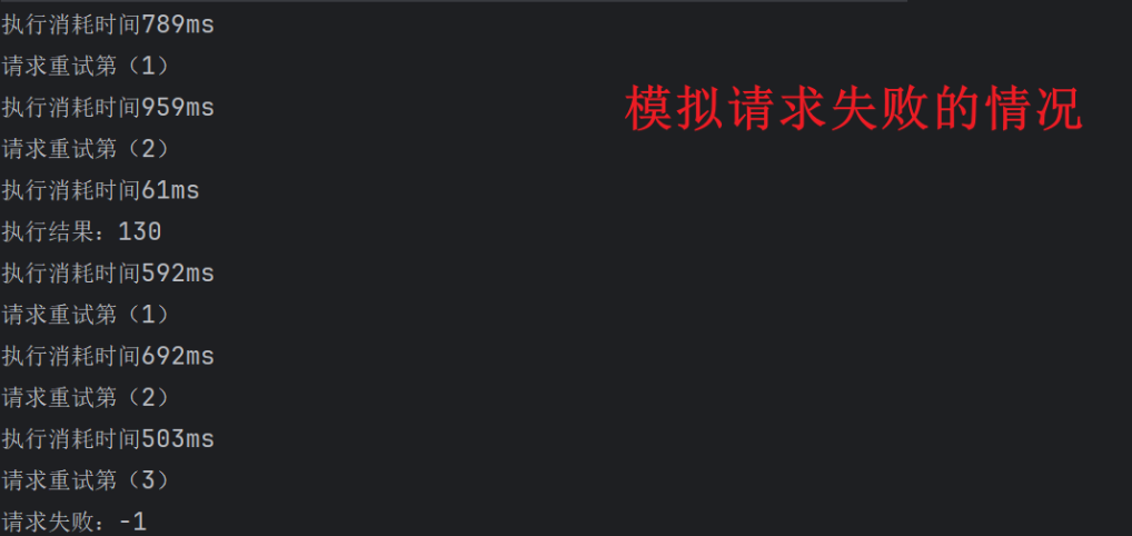 这个例子是模拟网络请求,服务对象模拟网络不稳定的第三方接口。代理对象模拟重试次数。