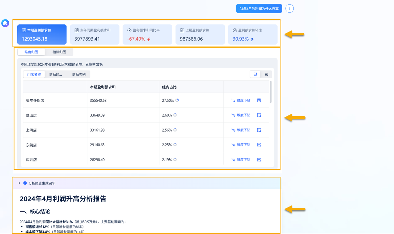 当你发现利润下降时,你可以连续追问 AI For BI:利润下降的主要原因是什么?、是成本上涨了,还是促销力度过大?系统会自动进行维度下钻,找出影响最大的因素。这种深度的逻辑推导能力,是传统静态报表无法提供的。