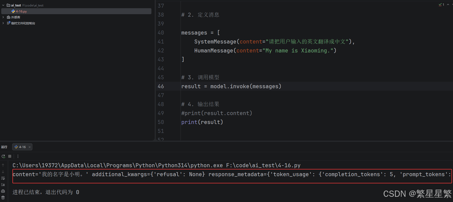 最开始可以按照普通流程来调用模型:先定义模型,再定义消息,然后通过 invoke 调用模型并拿到结果。