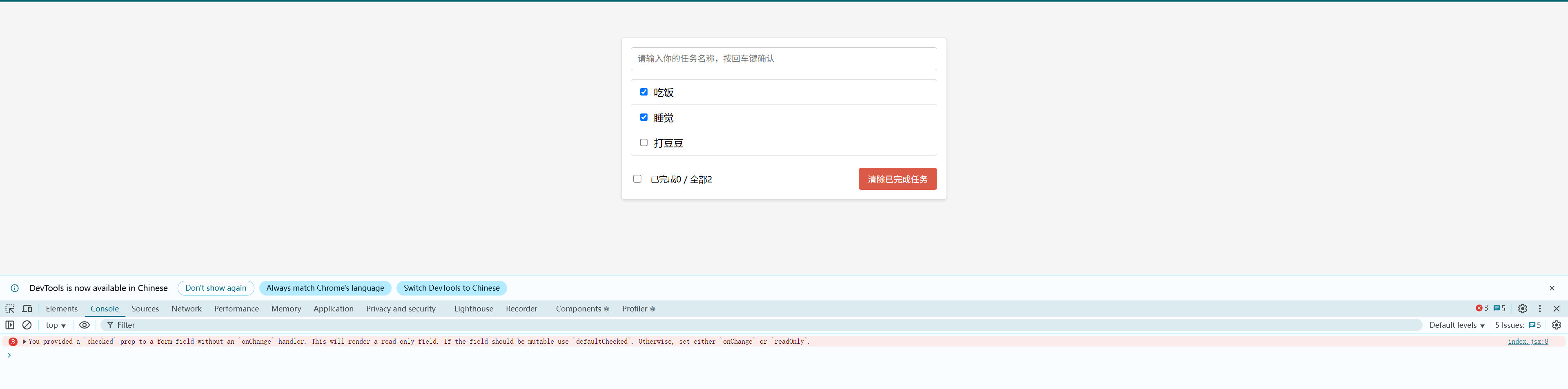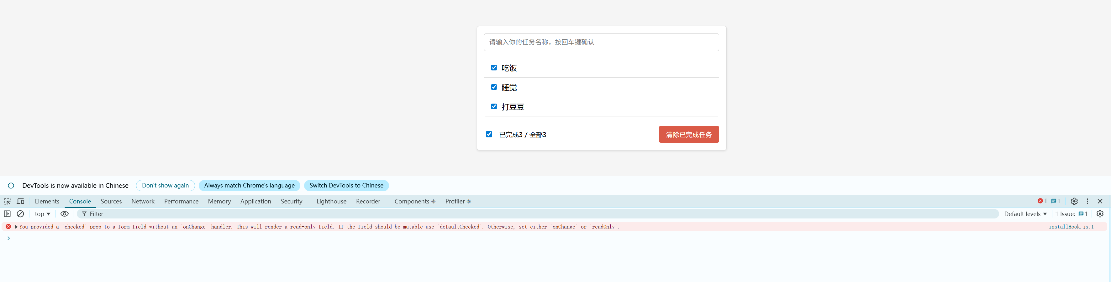 效果是没有问题的,但是控制台报错了,提示checked属性要和onChange事件一起使用;