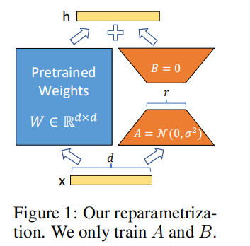 为了让 LoRA 在训练开始时不破坏预训练模型的输出分布,论文设定了明确的初始化方式: