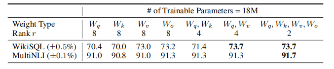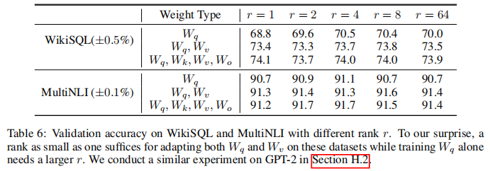 - 即便在 GPT-3 175B 这种超大规模模型上,极小的秩就足以表达任务适配所需的权重更新;