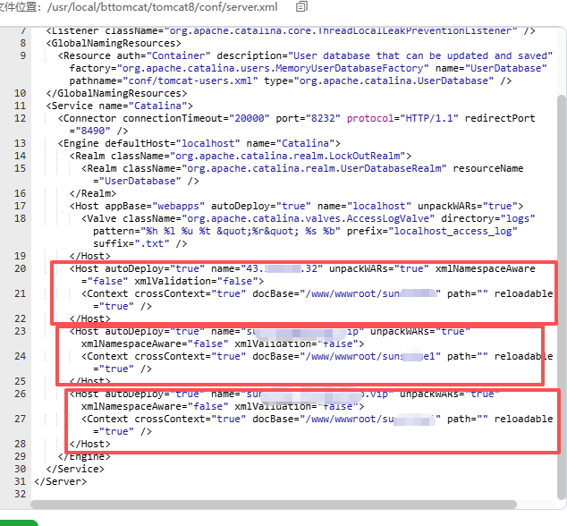 bash<Host autoDeploy="true" name="sunXXX.vip" unpackWARs="true" xmlNamespaceAware="false" xmlValidation="false"> <Context crossContext="true" docBase="/www/wwwroot/项目名称" path="" reloadable="true" /> </Host> -