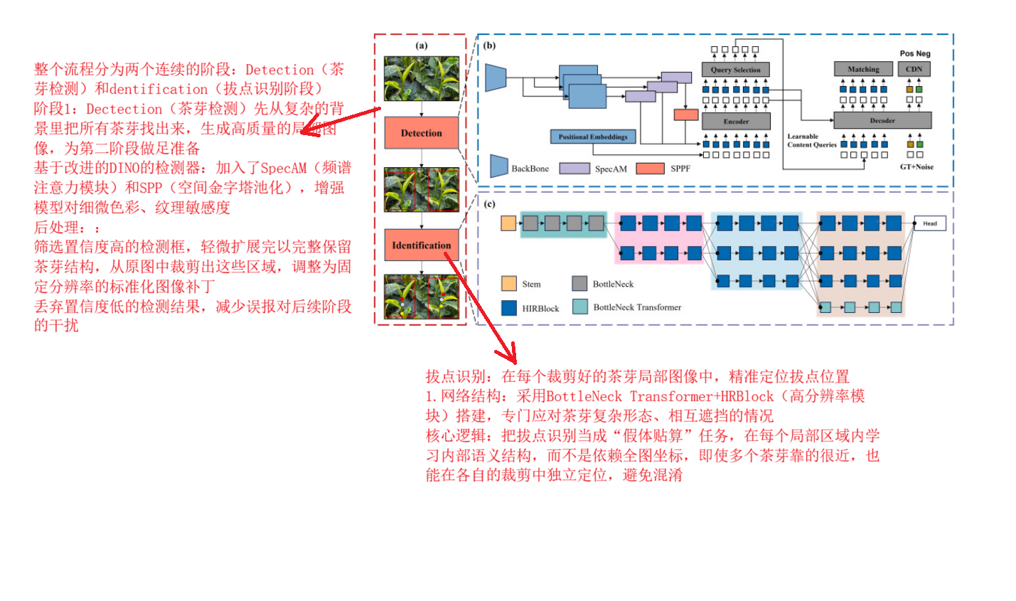 借鉴人体姿态估计的思路,采用"先检测茶芽、再识别拔点"的两级流水线
