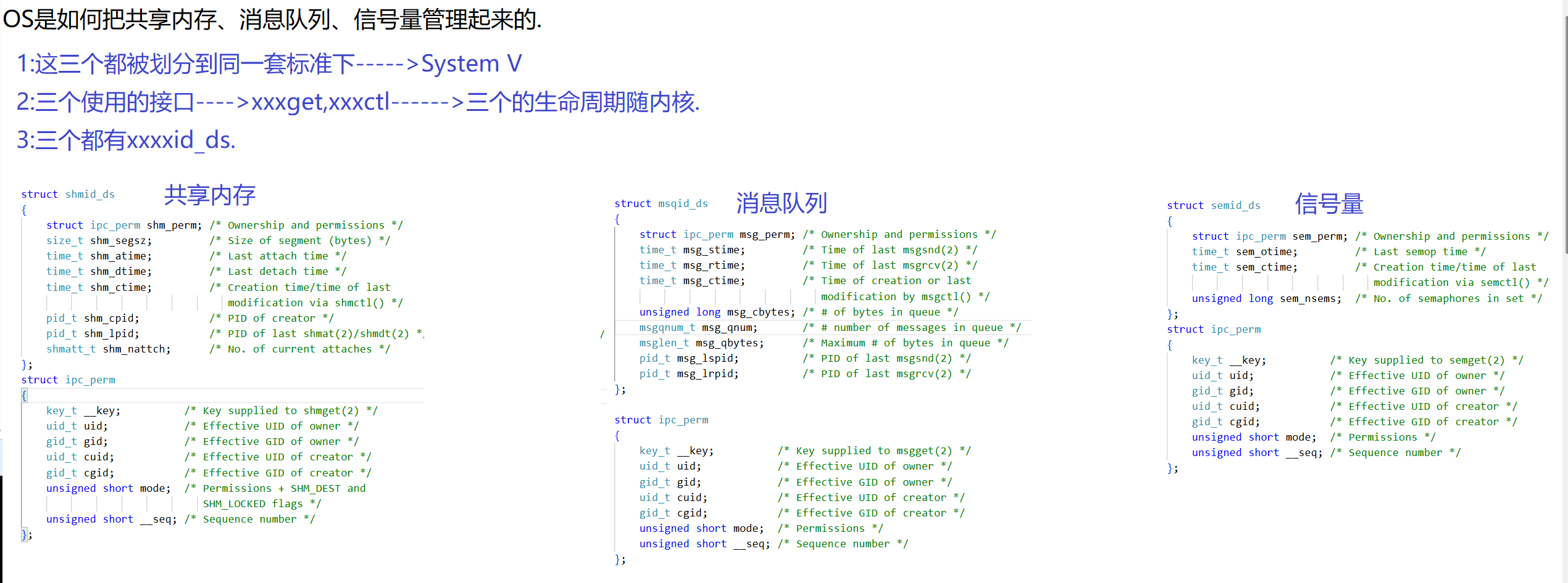 通过对system V系列进程间通信的学习,可以发现共享内存、消息队列以及信号量,虽然它们内部的属性差别很大,但是维护它们的数据结构的第一个成员确实一样的,都是ipc_perm类型的成员变量。