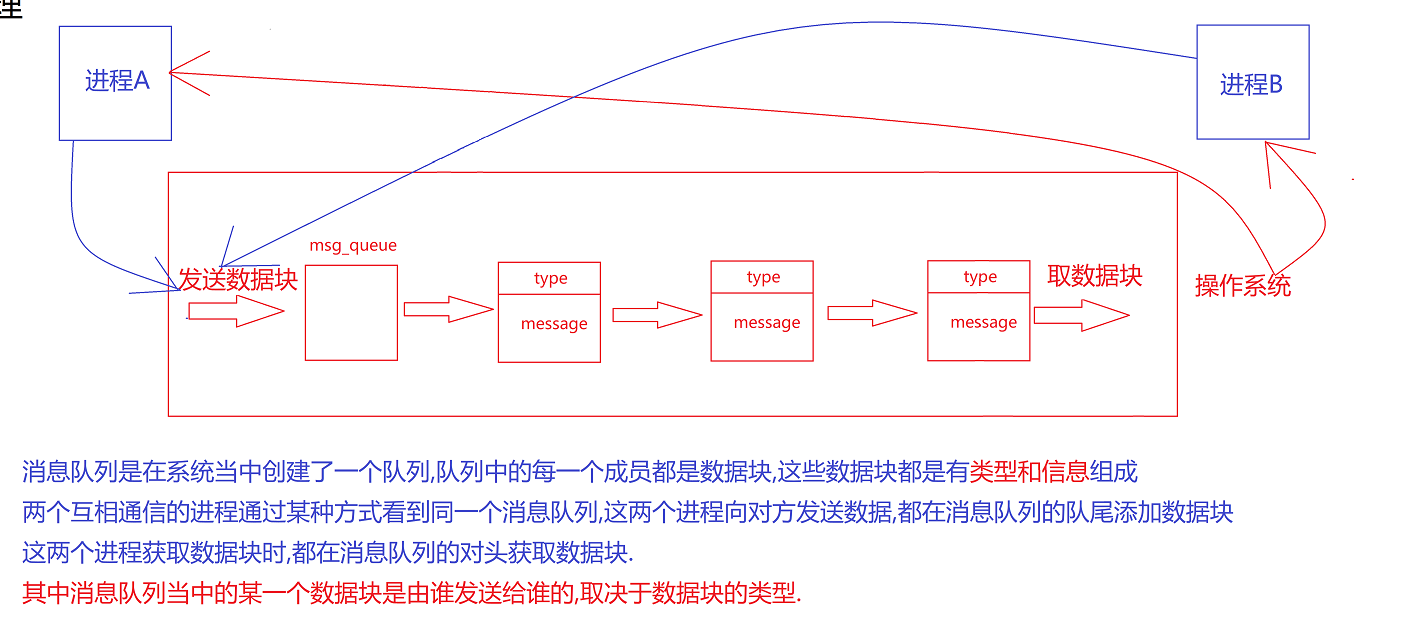 消息队列实际上就是在系统中创建了一个队列,队列中的每一个成员都是一个数据块,这些数据块都是由类型和信息两部分构成,两个互相通信的进程通过某种方式看到同一个消息队列,这两个进程向对方发送数据时,都在消息队列的队尾添加数据,这两个进程获取数据块时,都在消息队列的队头取数据块