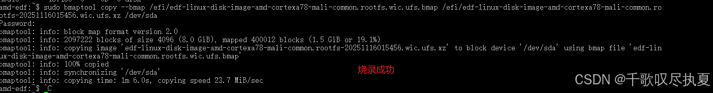 指令:sudo bmaptool copy --bmap /efi/edf-linux-disk-image-amd-cortexa78-mali-common.rootfs.wic.ufs.bmap /efi/edf-linux-disk-image-amd-cortexa78-mali-common.rootfs-20251116015456.wic.ufs.xz /dev/sda