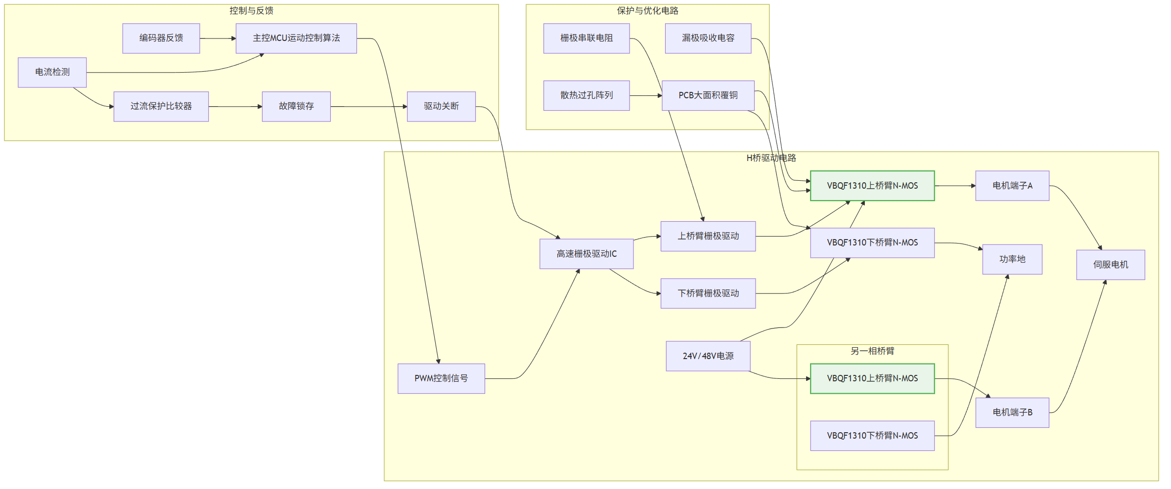 - 伺服驱动MOSFET(VBQF1310):必须使用高速驱动IC,优化栅极驱动电阻以平衡开关速度与EMI。