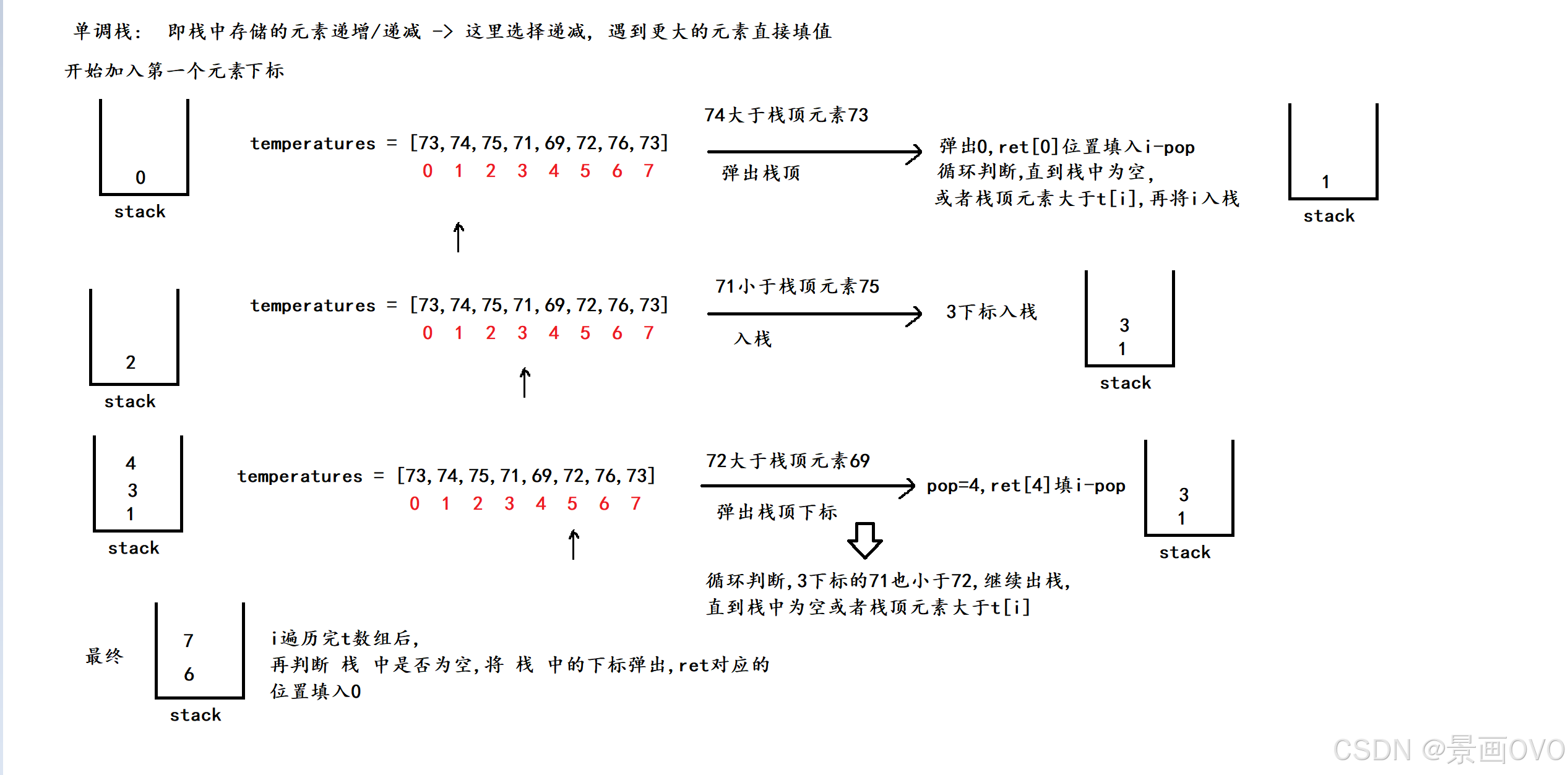 // 循环到这里说明队列为空或者temperatures[i] <= 栈顶元素
