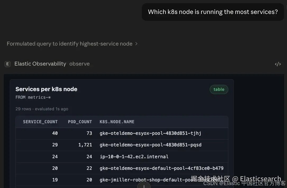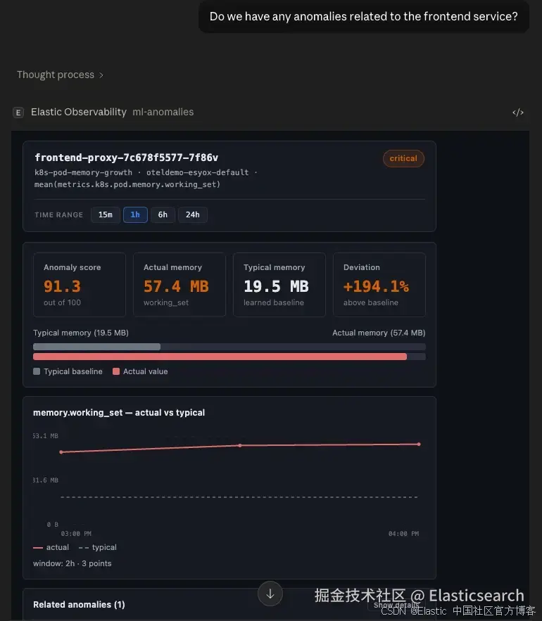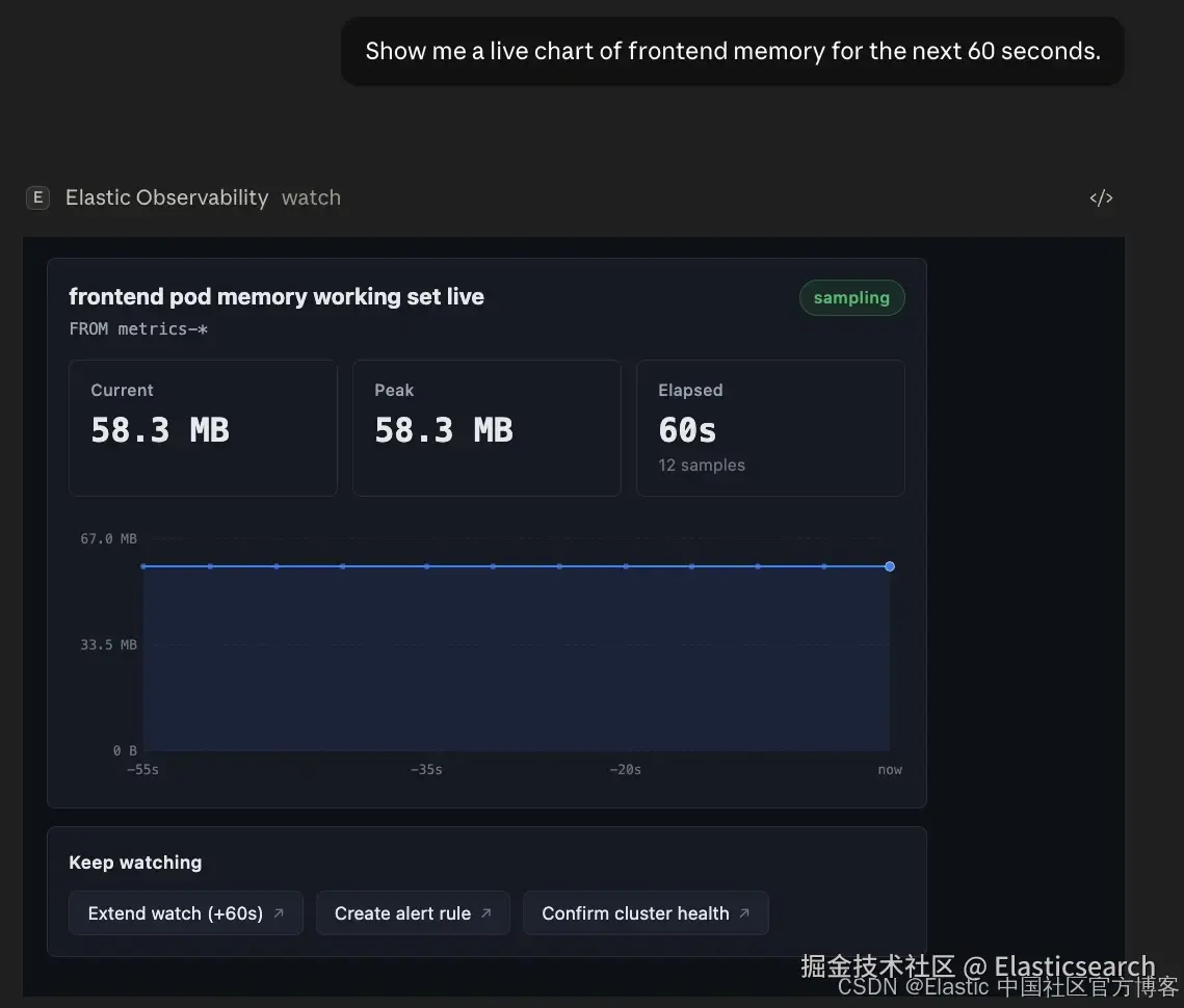Observe 是 agent 访问 Elastic 的主要 primitive ------ 一个 tool,支持两种 mode,用于三种不同需求。说"我的 Kubernetes clusters 的 network throughput 是多少",可以得到结果的 table 或 chart。说"当 memory 低于 80MB 时告诉我"或"在接下来的 10 分钟内监控 frontend memory 是否异常",它会阻塞直到条件触发或时间窗口结束。