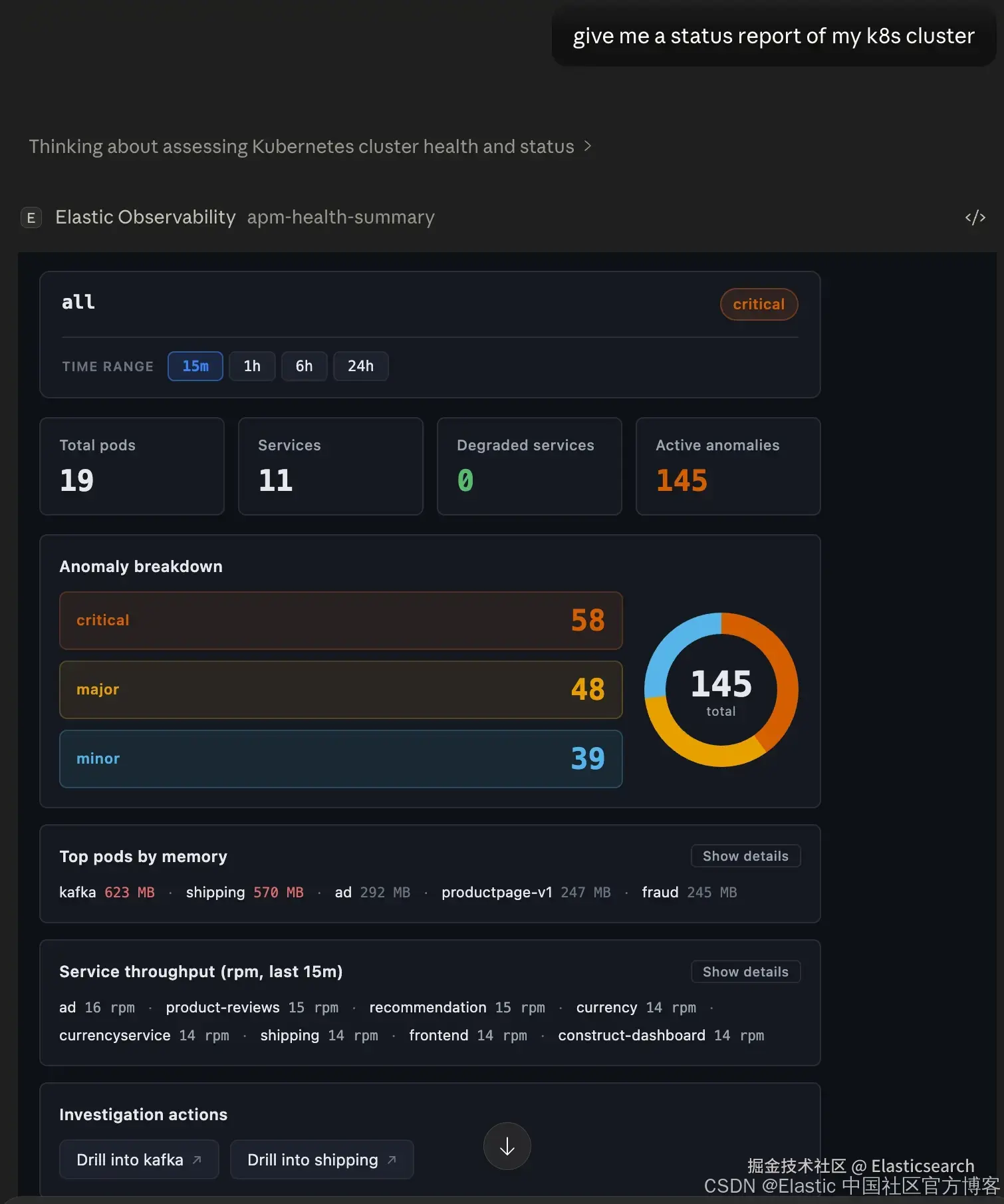 当你询问 "哪里坏了?" 或 "给我一个状态报告" 时,会得到一次性整体概览:整体健康状态标识、出现问题的服务及原因、top pod 内存消耗、异常严重程度分布以及 service 吞吐量 ------ 全部集中在一个内联视图中。