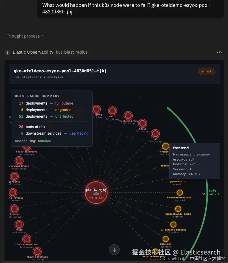 当你询问 "如果这个 node 宕机会发生什么?" 时,会得到一个放射状影响图:目标 node 位于中心,完全中断的 deployments 用红色标记,性能下降的用琥珀色标记,未受影响的用灰色标记。