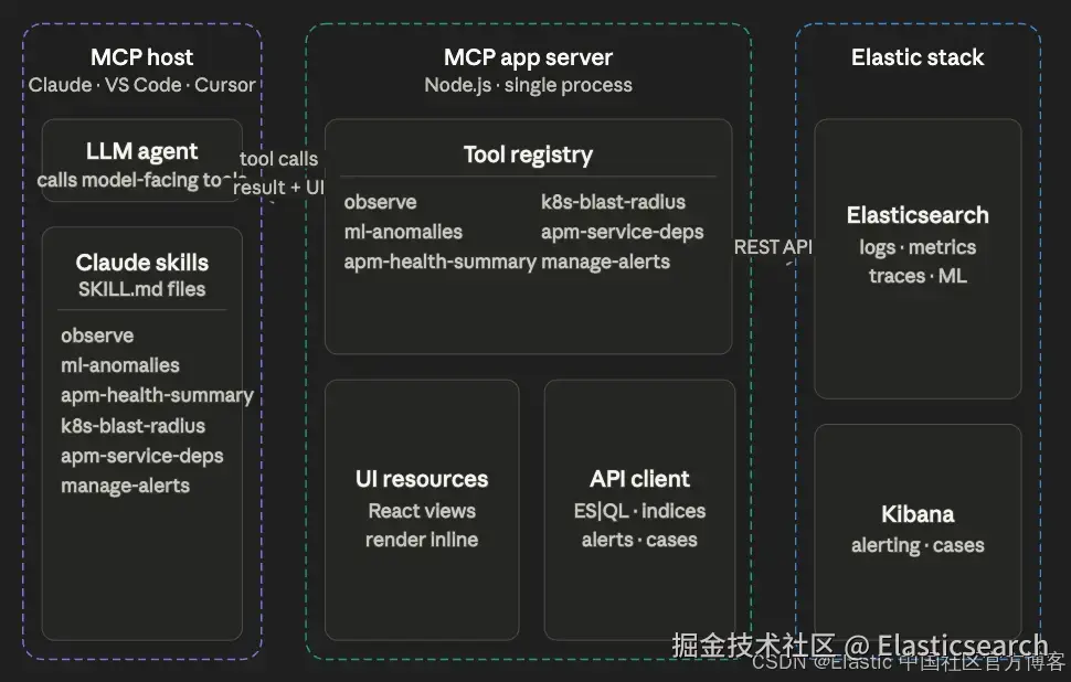 下面的图展示了该应用的三个组成部分:MCP host(如 Claude Desktop、VS Code 或类似环境),其中包含 LLM 以及教会它如何使用 tools 的 Claude skills;MCP app server,一个单一的 Node.js 进程,负责暴露 tool registry、打包 React UI views,并处理与 Elastic 的所有通信;以及 Elastic Stack,本身由 Elasticsearch 和 Kibana 组成,作为实时数据与 alerting 后端。