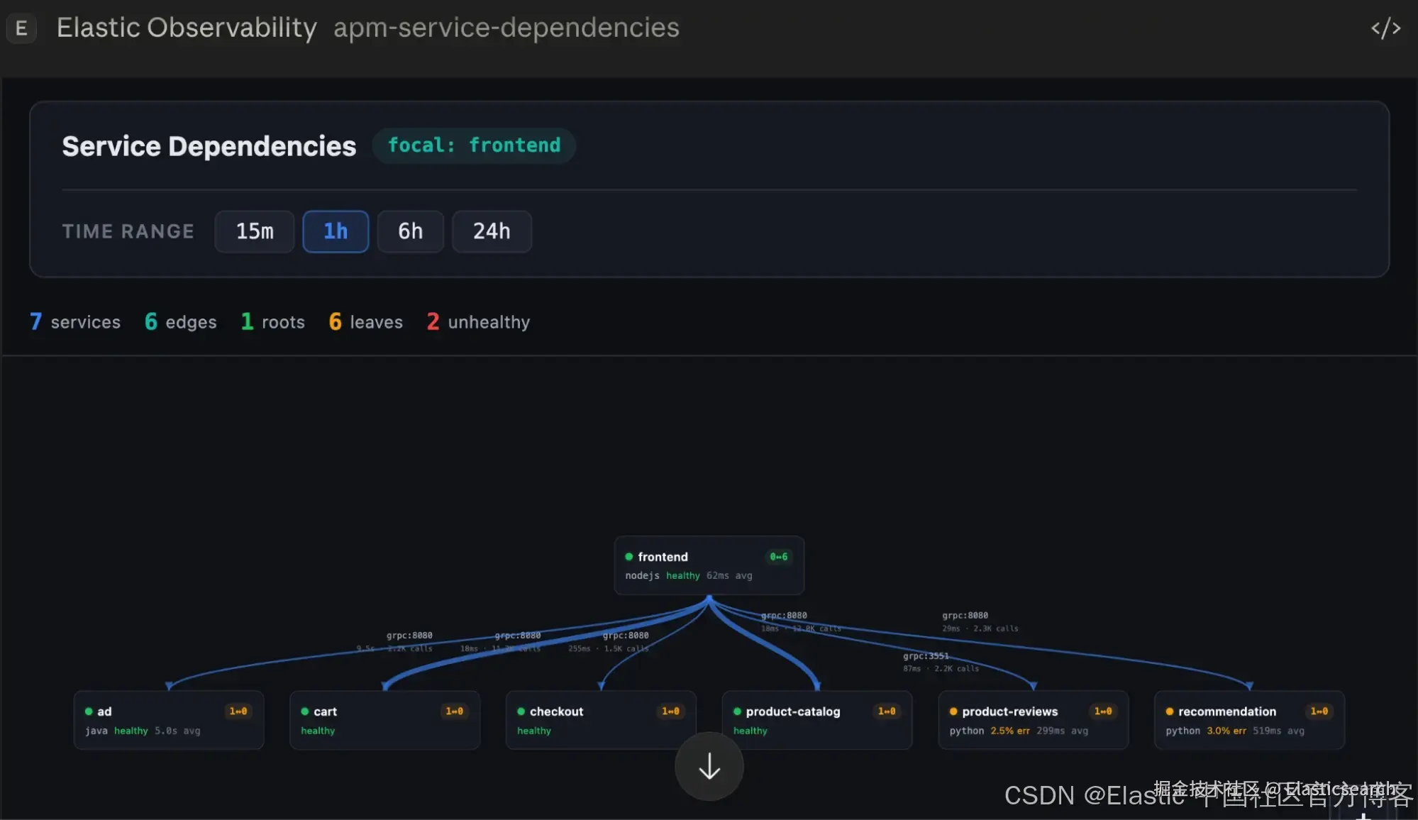 该视图会根据你的部署能力动态适配。如果有 APM,则会展示 service health;如果有 Kubernetes metrics,则会增加 pod 和 node 上下文;如果启用了 ML jobs,则会叠加异常检测。如果某个信号不存在,视图不会失败,而是明确告诉你缺少什么。我们将从 Kubernetes 集群的状态报告开始: