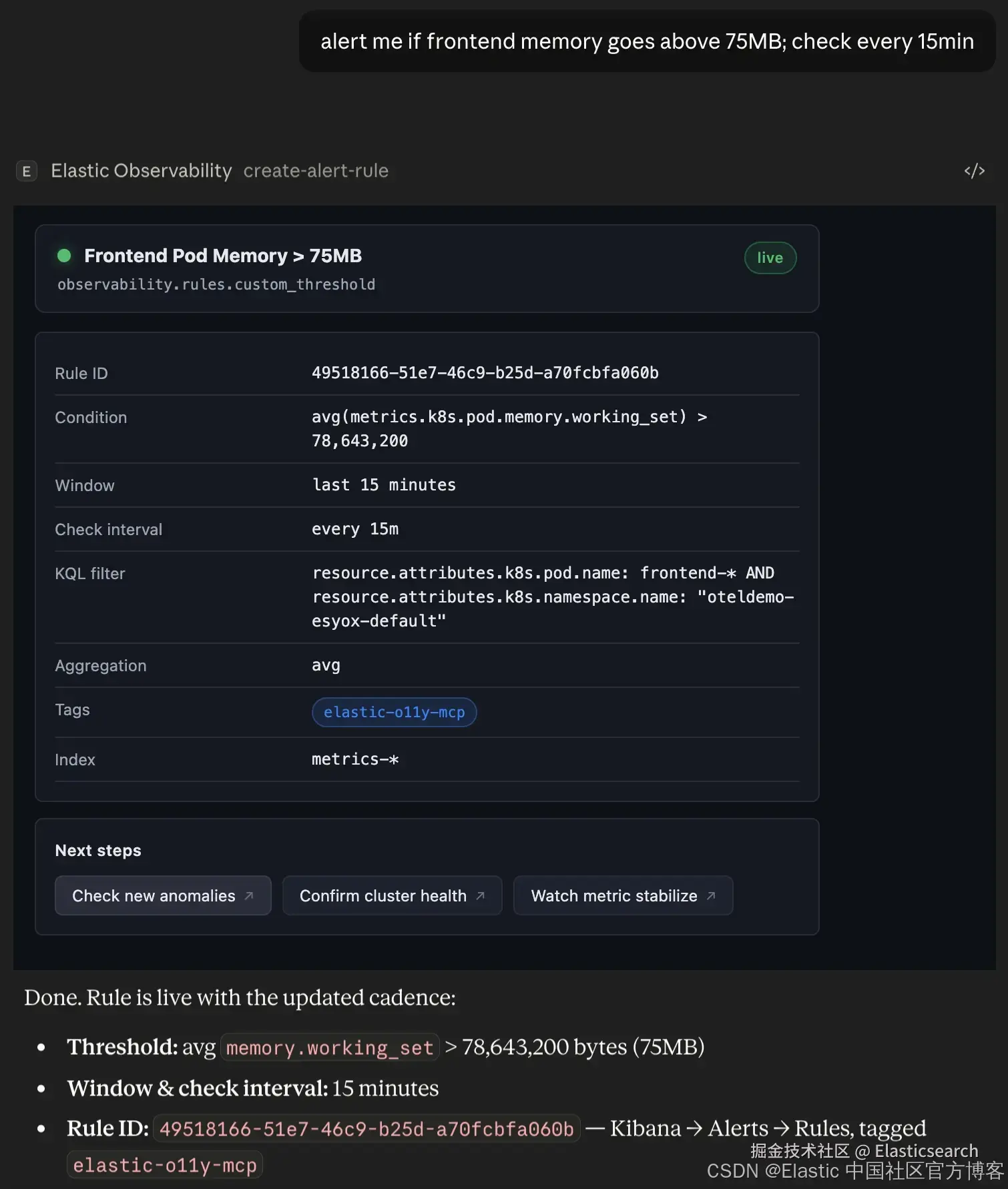 说 "如果 frontend 内存超过 75MB 就提醒我",agent 会创建一个持久化的 Kibana alerting rule ------ 一个在对话结束后仍会持续运行的 saved object。该视图会渲染一个实时 rule card:包含 rule name、condition、window、check interval、KQL filter 和 tags。