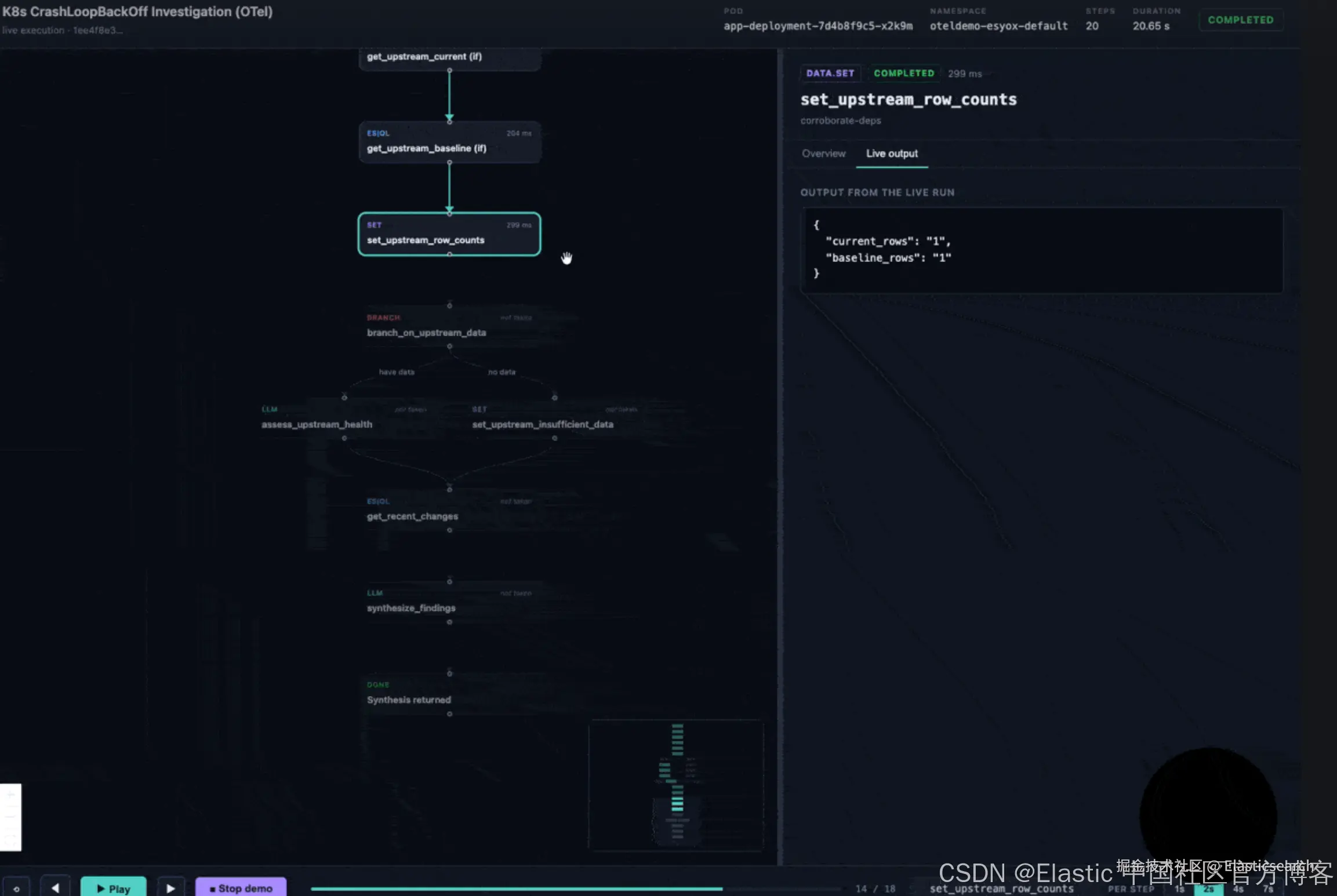下面的示例执行基于运行在 Elastic 上的 OpenTelemetry Astronomy Shop ------ 包含 16 个服务、Kafka、PostgreSQL,并通过 OTLP 预先完成可观测性接入。除了 Shop 的真实遥测数据之外,我们还注入了一个合成的 OOMKill 连锁事件,该事件通过 EDOT 数据流写入同一个 namespace 中的合成 K8s 和 APM 信号。该 workflow 无法区分这些信号是真实还是模拟的------它只负责调查 alert 本身。