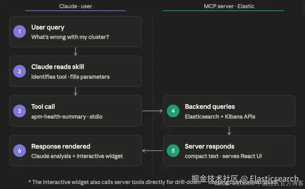 下图展示了用户请求的完整流程:Claude 读取相关的 skill 文件,以理解应该调用哪个 tool 以及如何填充其参数;随后调用该 tool,触发对 Elasticsearch 和 Kibana 的服务端查询;最后返回一个压缩的文本摘要,以及一个 React UI resource,该资源会以内联方式渲染为一个可交互 widget。