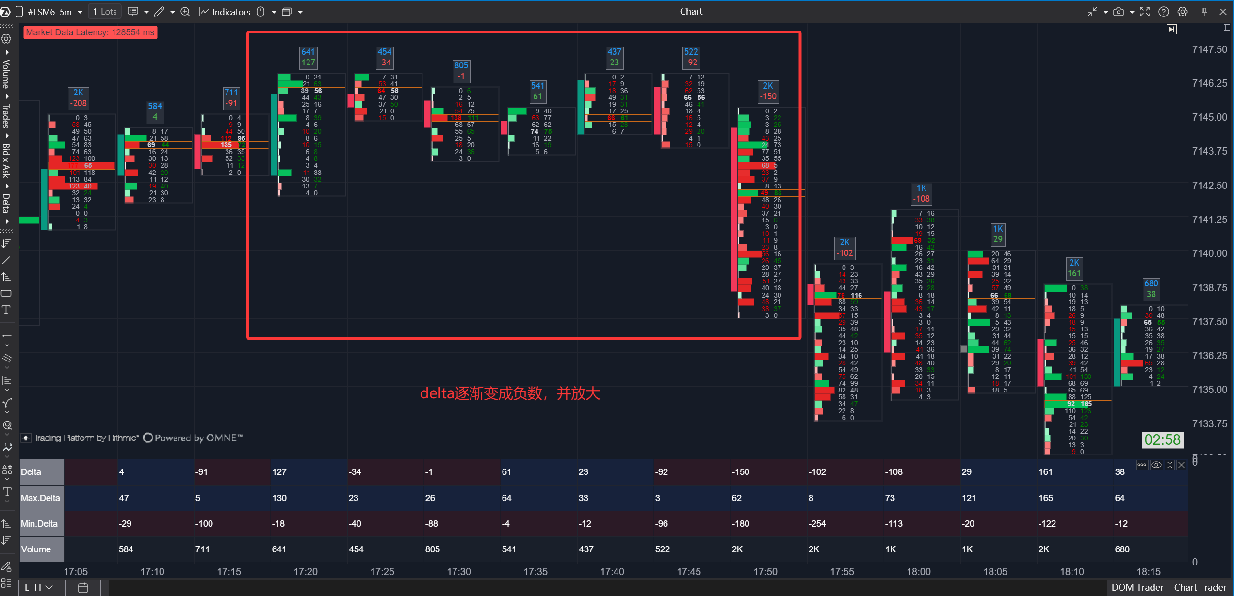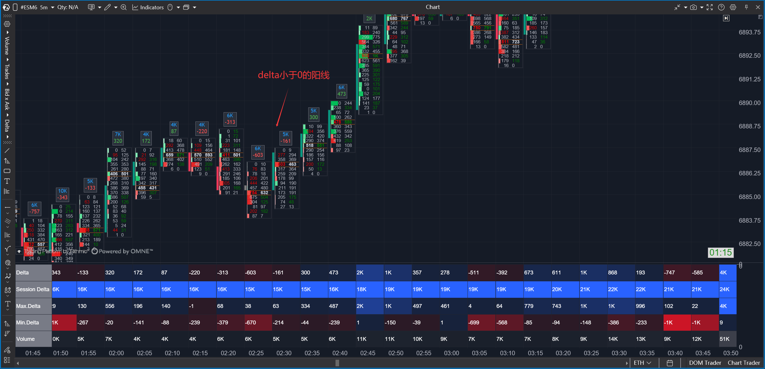 - 多头转空头:上升K线的delta越来越小,买入力量越来越弱,随着空头的加入,出现较强的负delta