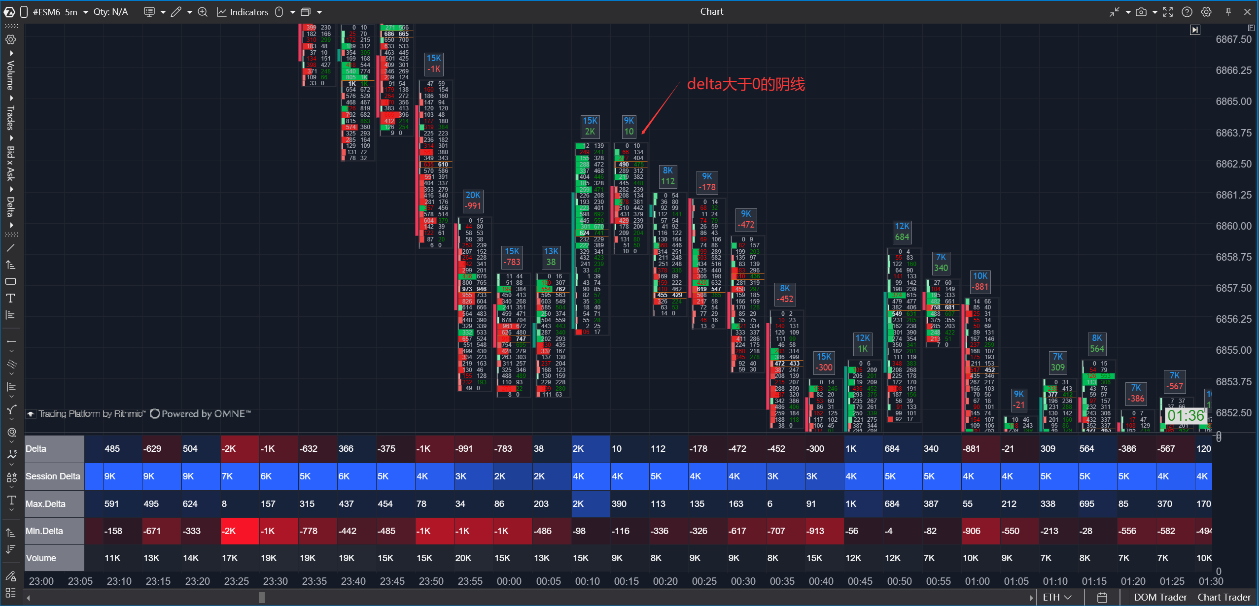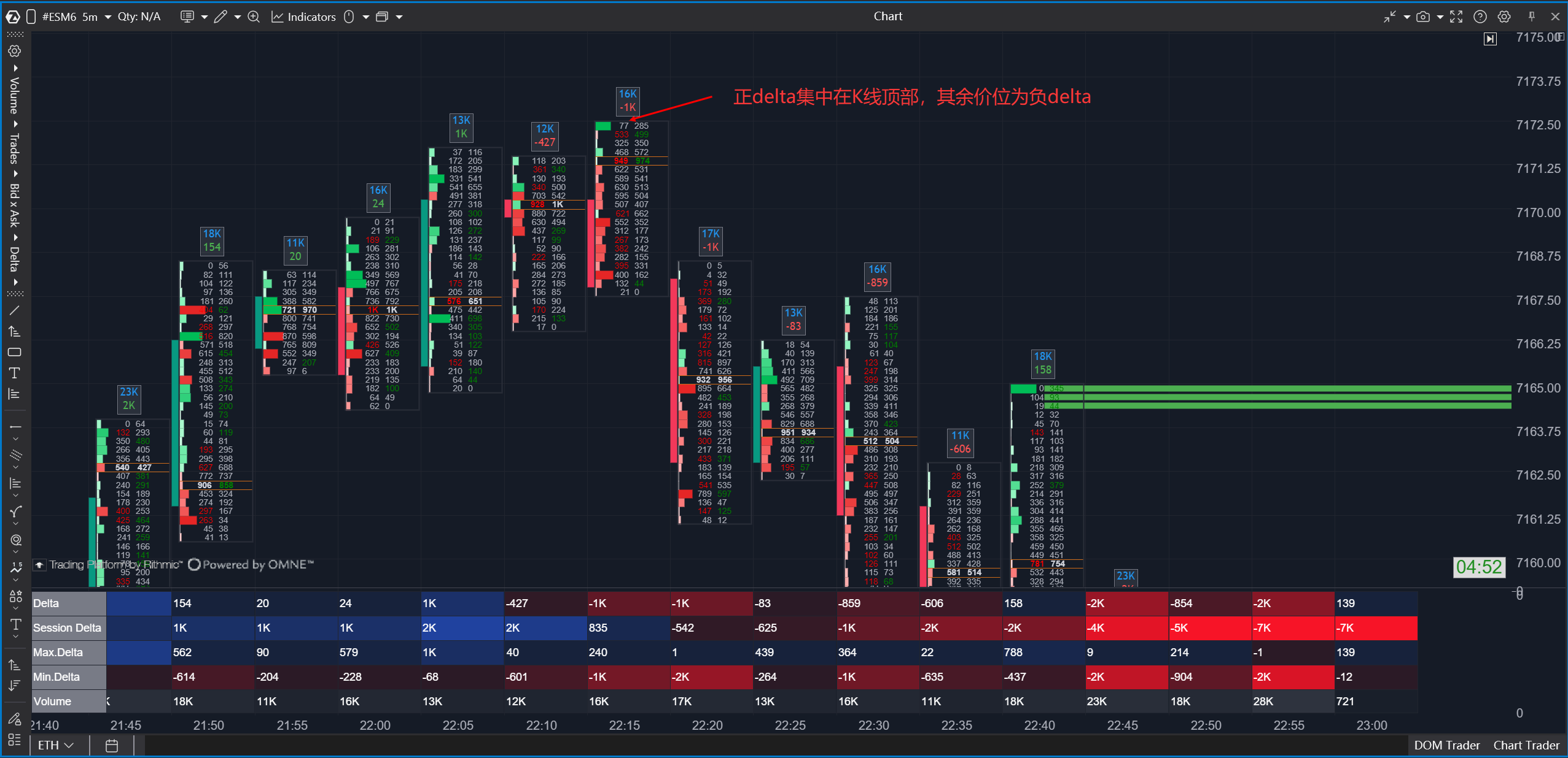 - 阴线,阴线的顶部是正delta, 剩下的价位都是负delta