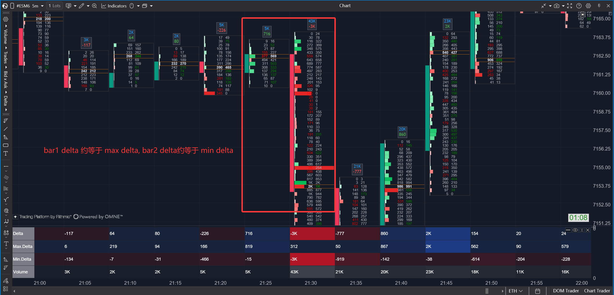 - 第一根K线的max Delta约等于0(或很小),该K线的delta约等于min Delta;第二根K线的min Delta约等于0(或很小),同时该K线的delta约等于max Delta。