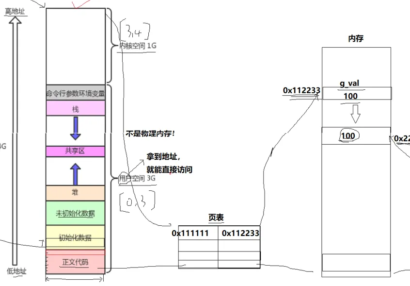 比如说,我们在修改一个变量假设叫 val 的值的时候,这个变量的虚拟地址,在 0x11111 处, 页表的左边放的就是这个变量的虚拟地址,右边放的就是这个变量的物理地址,假设叫0x112233,当我们对虚拟地址操作的时候,页表就会映射到对对应的物理地址的操作。 这个映射的过程其实要通过硬件,现阶段我们理解为操作系统来操作也行。