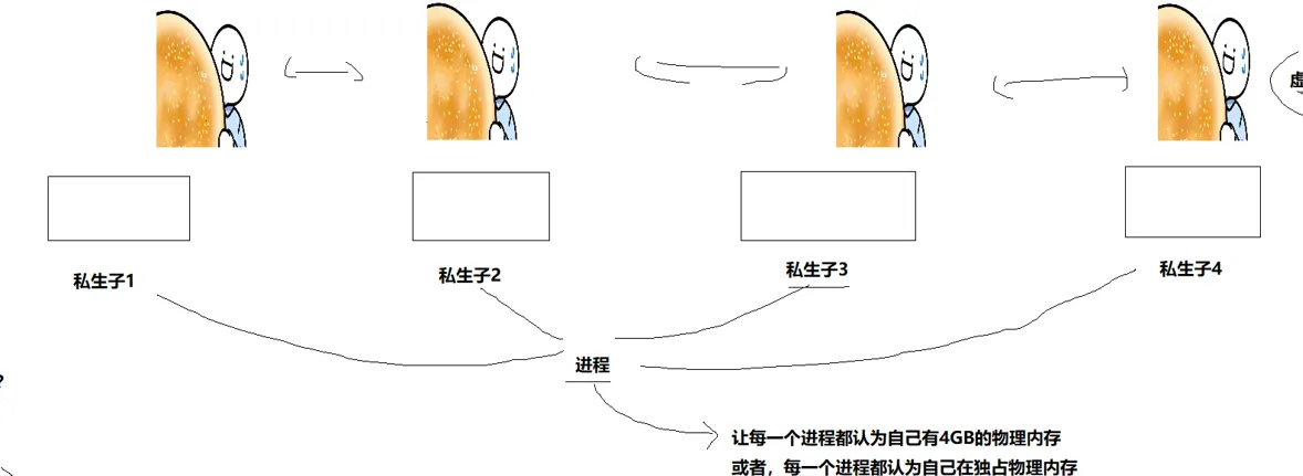 其实到这里,已经初见端倪了,大富翁呢,就是这个物理内存, 私生子就是进程, 虚拟地址空间就是大富翁给私生子画的大饼。 所以,虚拟地址空间的存在,让每一个进程都认为自己有 4GB 的物理内存,或者说,让每一个进程都以为自己独占物理内存。