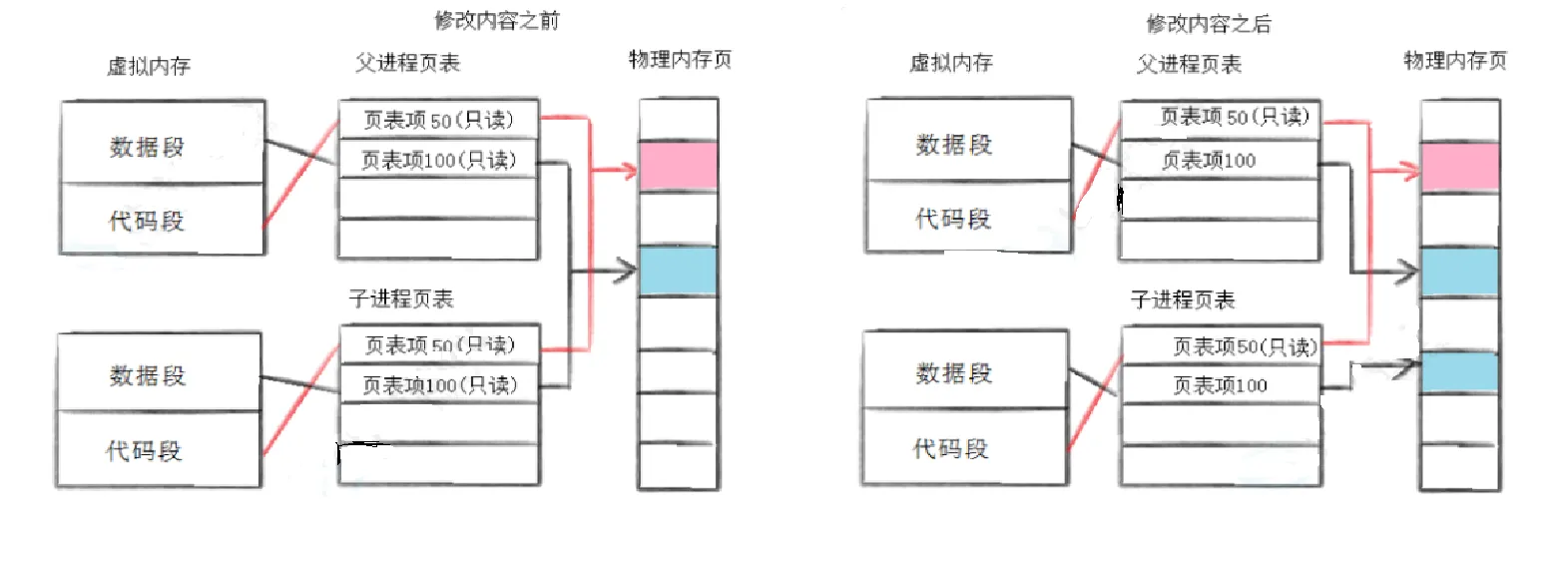这样,也就完成了之前看起来很怪的地址相同但是值不同的效果,本质上其实就是同一个虚拟地址映射到了不同的物理地址。这也是写实拷贝的原理,当然写实拷贝还有一些细节,后面详细说。