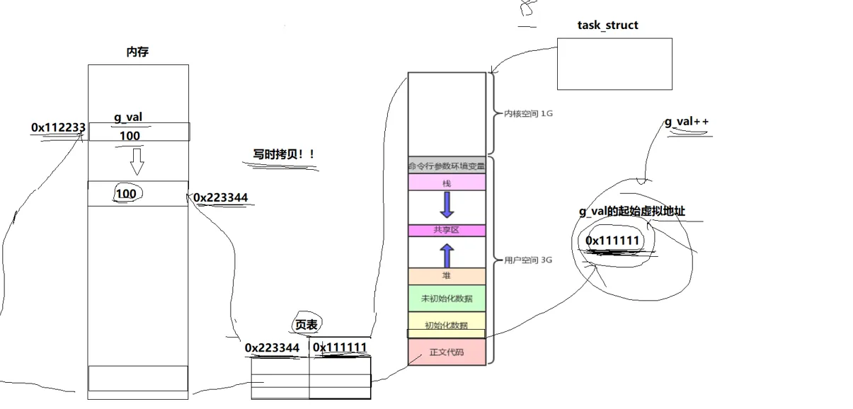 当子进程想要对数据进行修改的时候,会发生什么? 写实拷贝。 由于,子进程和父进程程序地址空间一模一样的,页表也一模一样的,子进程想要修改的变量,假设还是 g_val ,要被修改,操作系统去查页表,映射到物理地址,但是这里已经有值了,所以,操作系统会在内存里面再开辟一块空间,拷贝一份 g_val 然后再做修改,最后,修改一下页表的映射关系就好,