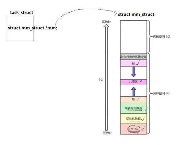 这个图里面的这个东西其实就是一个mm_struct。 task_struct 里面有指针指向这个它自己的程序地址空间。