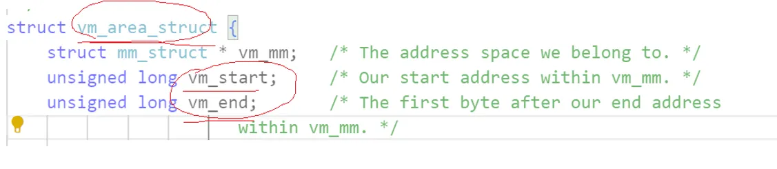 里面也有一个起始地址和一个终止地址。答案已经呼之欲出了, vm_area_struct 就是来解决我们之前说的堆是一段一段的问题的。每一段,都有一个 vm_area_struct 来描述,然后放到一张表里面,交给这个进程的 mm_struct 来管理。这样,我们使用 mm_struct 遍历整个表,需要那一段用哪一段。注意,这个 vm_area_struct 如果很多的话,也可以放到红黑树里面, vm_area_struct 就是节点,存着指向下一个节点的指针。
