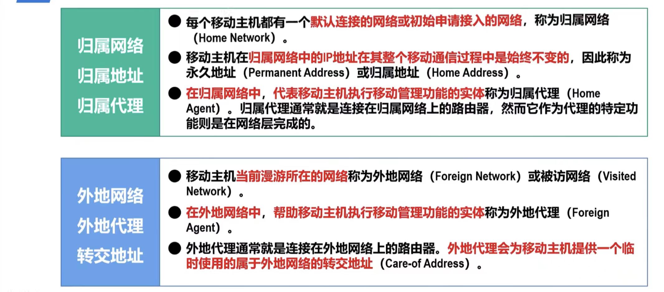 FA (Foreign Agent, 外地代理):外地网的路由器,提供转交地址(CoA)