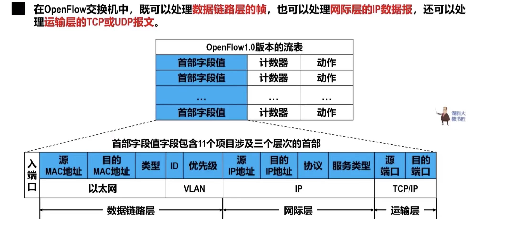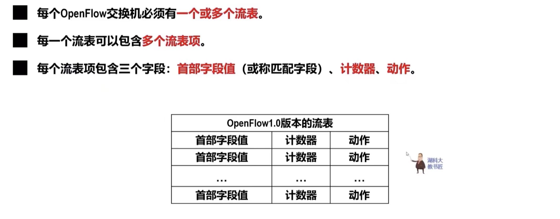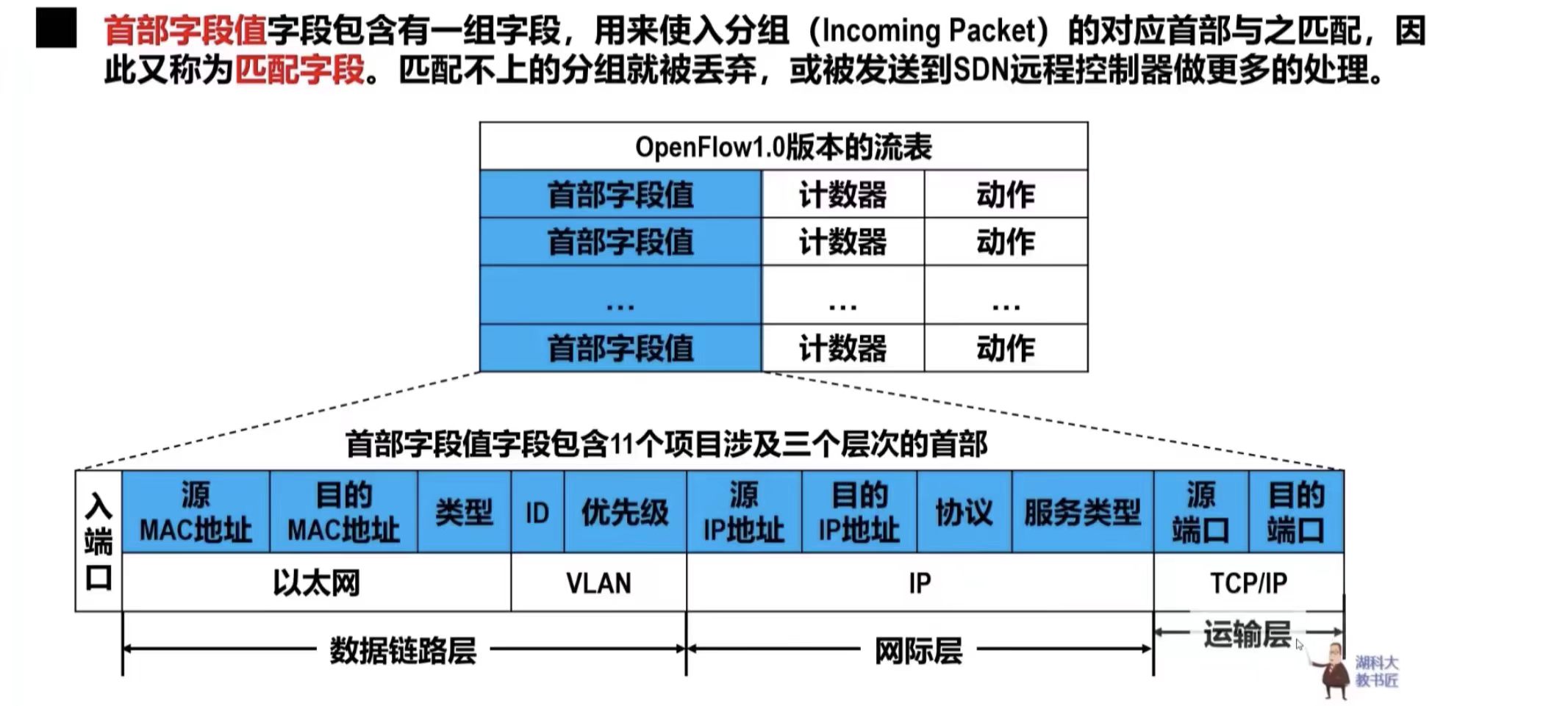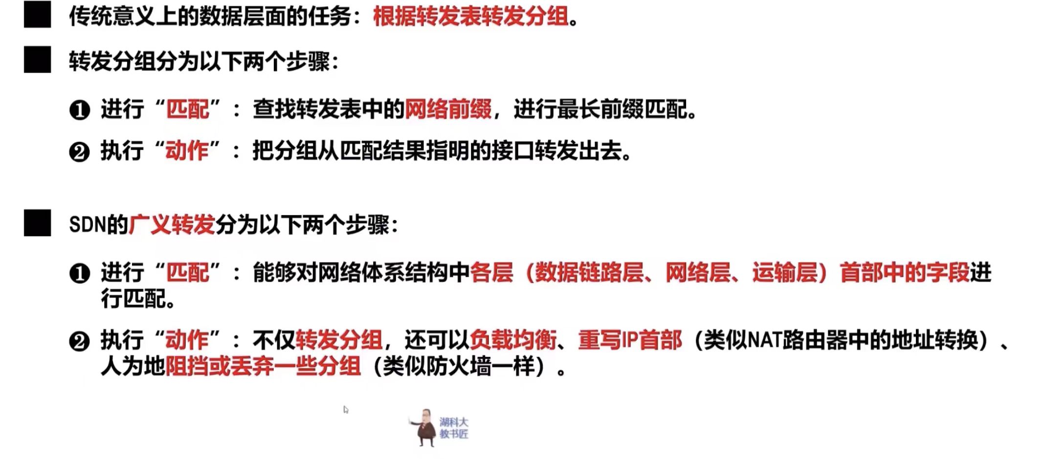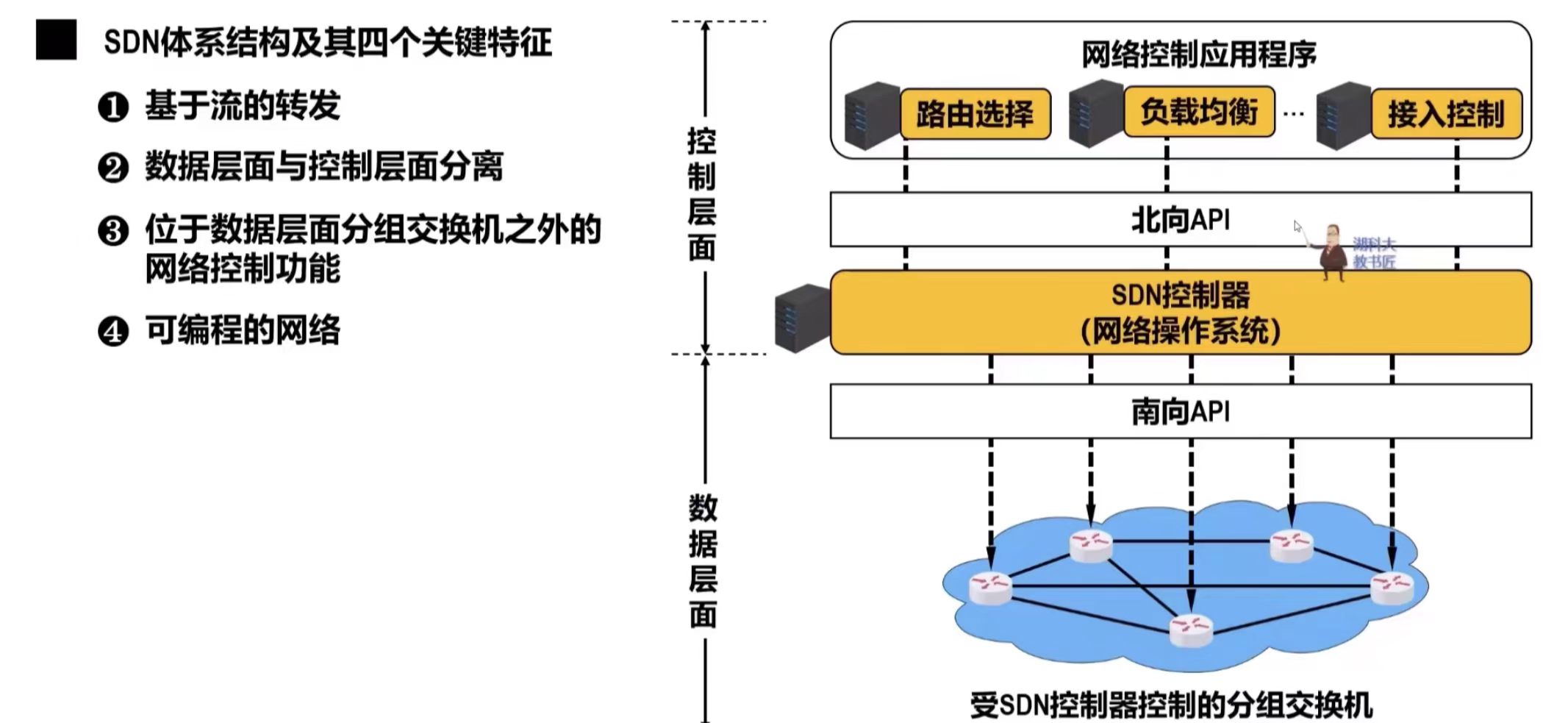 - 在SDN体系结构中,路由器中的路由软件都不存在了。因此,路由器之间不再交换路由信息,在控制层面中,有一个逻辑上集中的远程控制器,它在物理上可由不同地点的多个服务器组成。