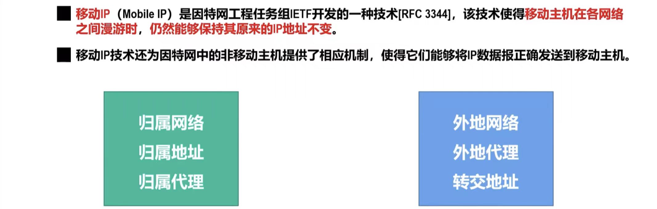 总结:永久地址管身份,转交地址管位置;家乡代理转发,隧道技术穿透,移动不换IP、不断网。