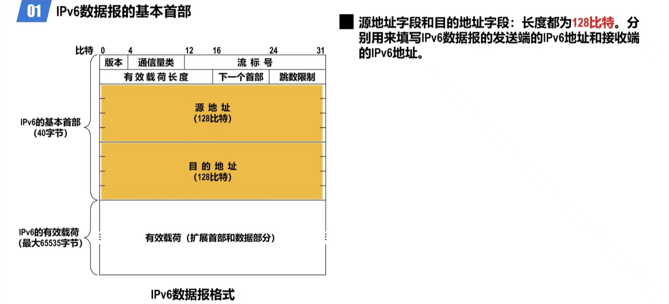IPv6将IPv4数据报首部中不必要的功能取消了,这使得IPv6数据报基本首部中的字段数量减少到只有8个。但由于IPv6地址的长度扩展到了128比特,因此使得IPv6数据报基本首部的长度反而增大到了40字节,比IPv4数据报首部固定部分的长度(20字节)增大了20字节。