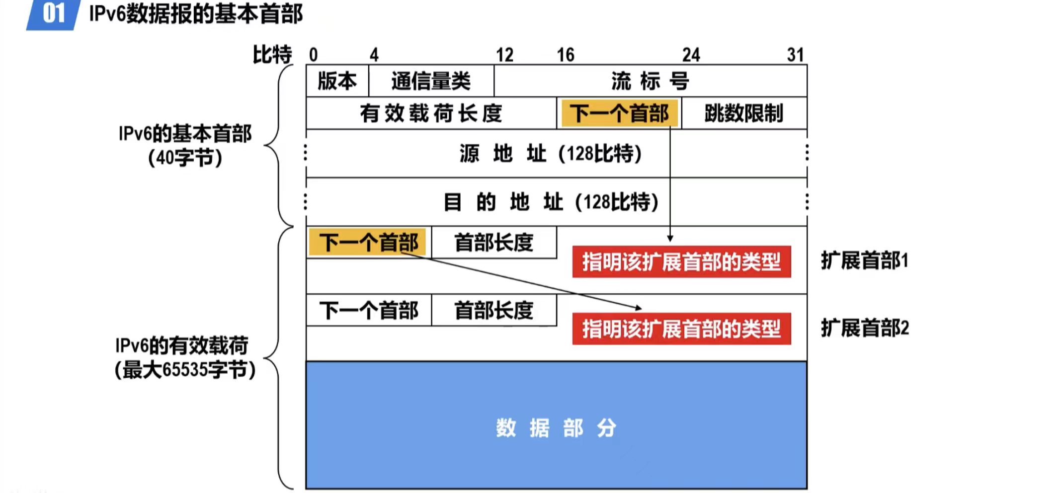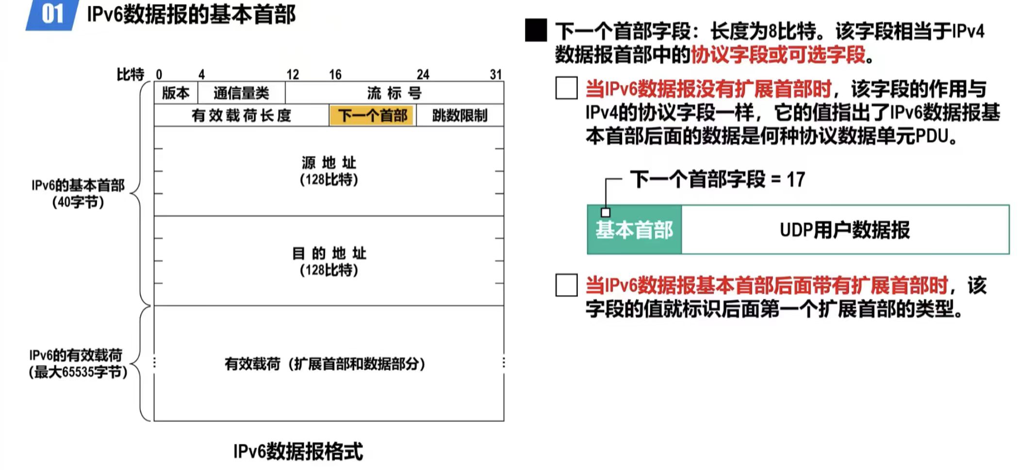- 取消了协议字段,改用下一个首部字段。