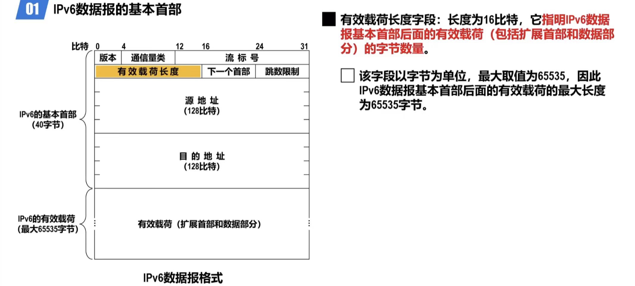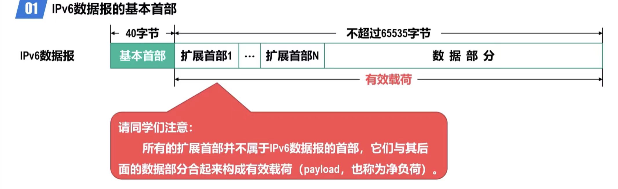 - 取消了总长度字段,改用有效载荷长度字段。这是因为IPv6数据报的首部长度是固定的40字节,只有其后面的有效载荷长度是可变的。