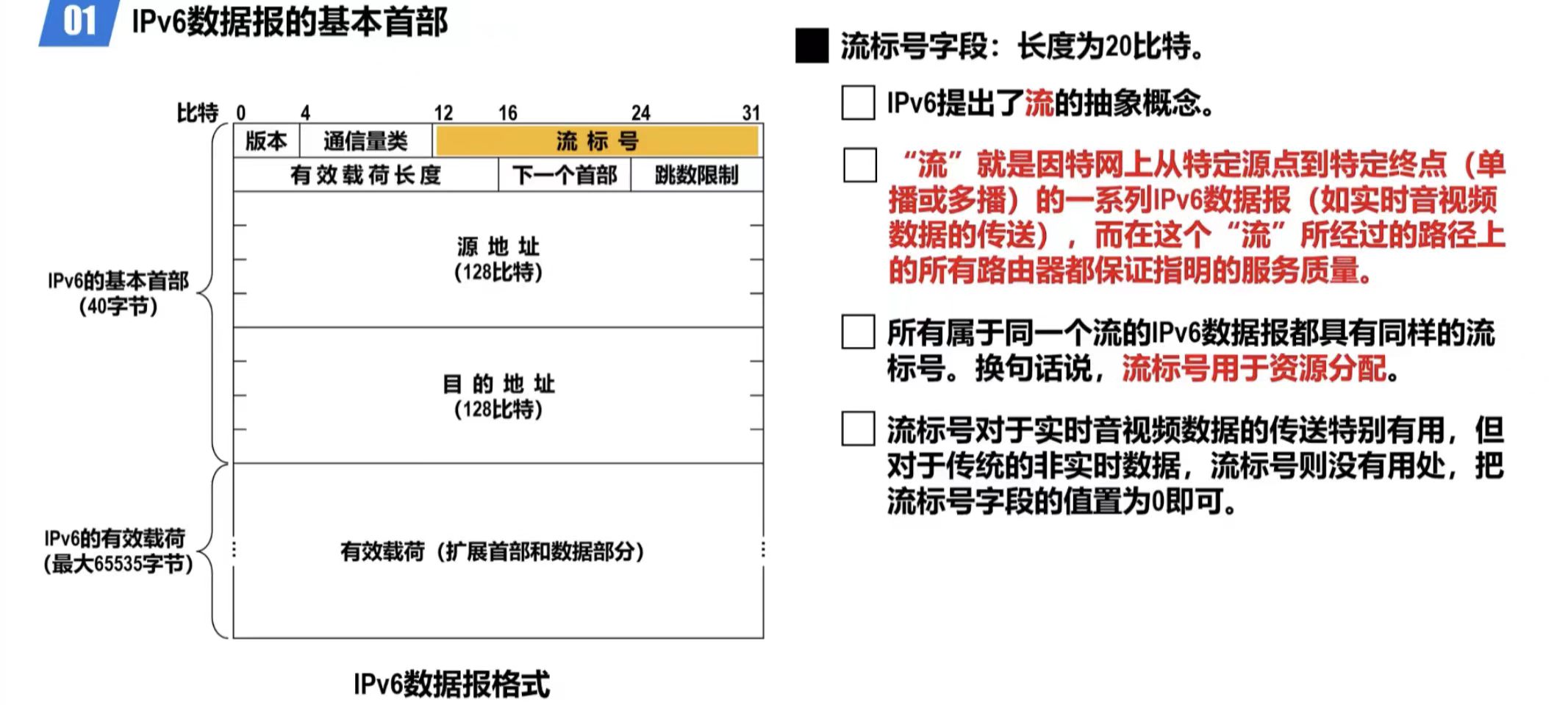 - 通信量类字段 :长度为8比特,该字段用来区分不同的IPv6数据报的类别或优先级。目前正在进行不同的通信量类性能的实验。