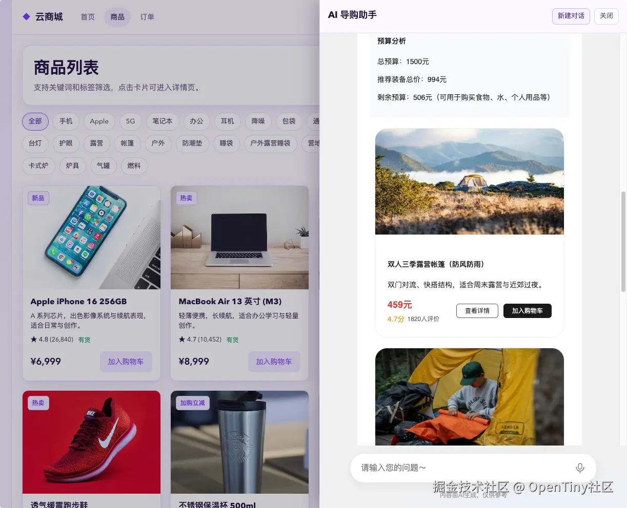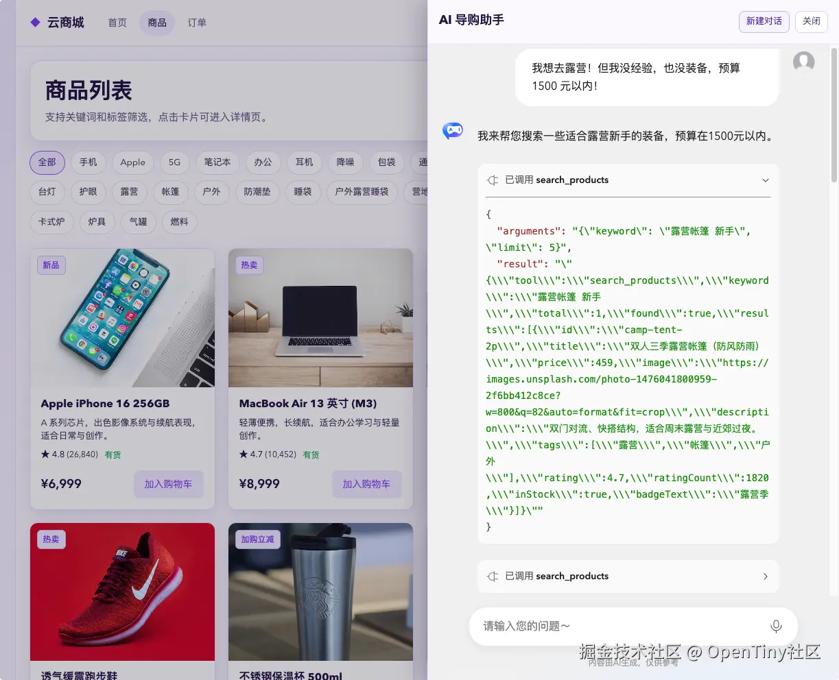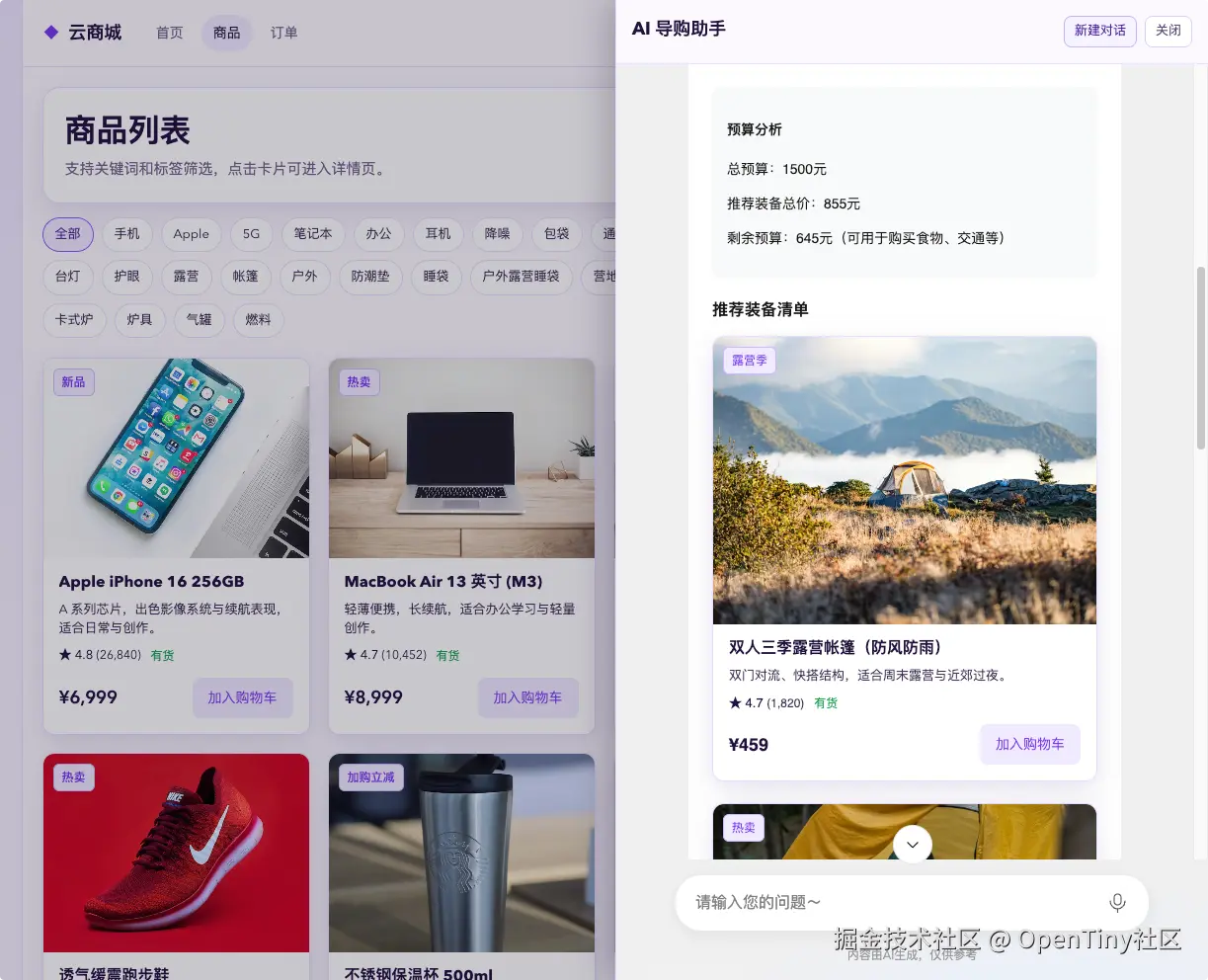刷新页面后,重新输入刚刚的问题:"我想去露营!但我没经验,也没装备,预算 1500 元以内!" 可以看到,现在的商品卡片已经和电商系统中的保持一致了。